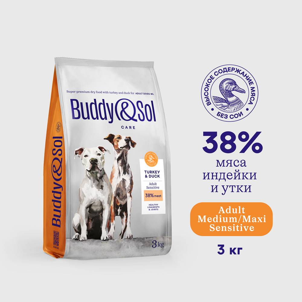 Сухой корм суперпремиум-класса Buddy&Sol Care ADULT с индейкой и уткой специально разработан для собак средних и крупных пород с чувствительным пищеварением.