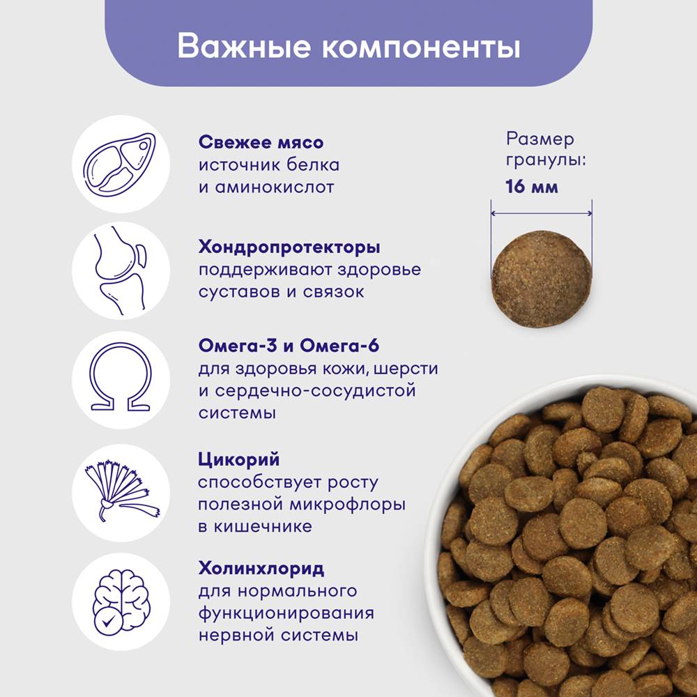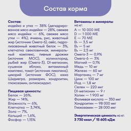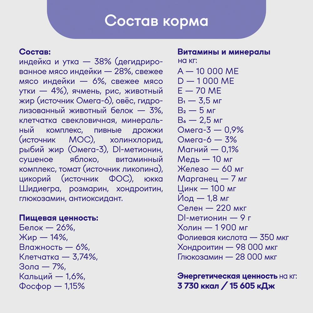 Сбалансированный состав обеспечивает потребности питомцев, препятствует набору лишнего веса, предотвращает заболевания суставов, а ненасыщенные жирные кислоты Омега-3 и Омега-6 поддерживают здоровье мозга и органов зрения.