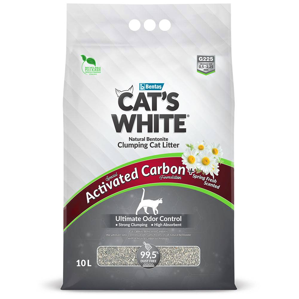 Плотные комки надежно удерживают влагу, не крошатся и легко удаляются из лотка, поэтому полная замена наполнителя не требуется. Благодаря этому CAT’S WHITE® удобен и экономичен. На 99,5% очищен от пыли, не оставляет следов в доме и безопасен для кошек и их владельцев. Забота об окружающей среде. Мягкая премиальная эко-упаковка CAT’S WHITE® ACTIVATED CARBON SPRING FRESH SCENTED полностью подлежит переработке.