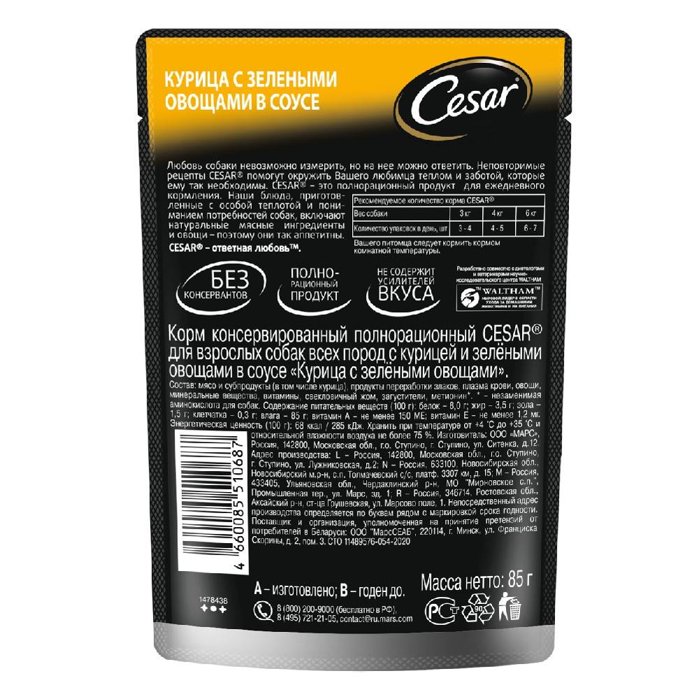 Это аппетитные кусочки из курицы с отборными овощами в густом ароматном соусе. Аппетитные блюда CESAR® – это вкусные, сбалансированные рационы для собак, которые помогут окружить вашего любимца заботой и вниманием. Рационы готовятся по уникальной рецептуре, в состав входят натуральные ингредиенты: они не содержат искусственных красителей, усилителей вкуса и консервантов. Блюда CESAR® обязательно придутся по вкусу вашему любимцу.