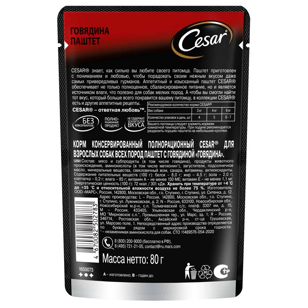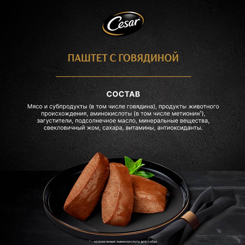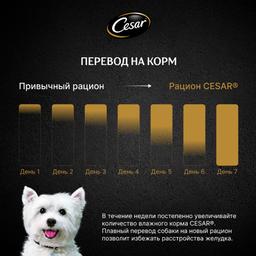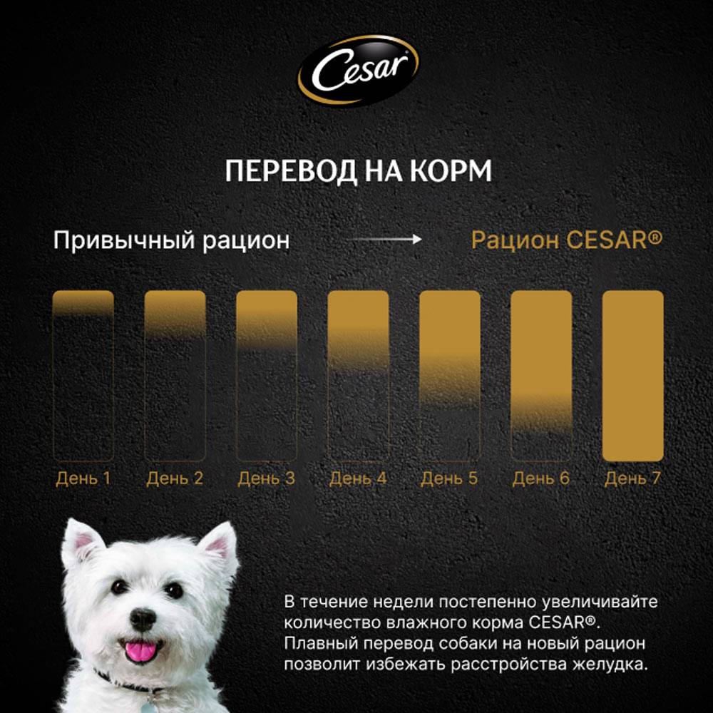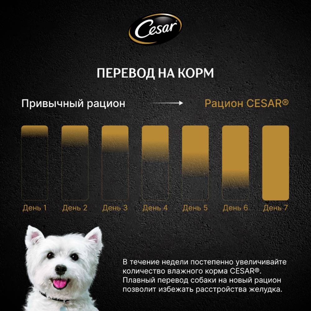 рекомендуемое количество корма CESAR® (вес животного, кг – упаковок корма в сутки, шт): 3 кг – 4; 4 кг – 5; 6 кг – 6-7. Вашего питомца следует кормить кормом комнатной температуры. Не забывайте о свежей воде, которая должна быть в миске вашего питомца постоянно.
