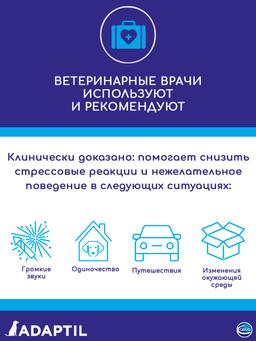 Эффективность Adaptil при хронических и острых стрессах у собак доказана клиническими испытаниями.