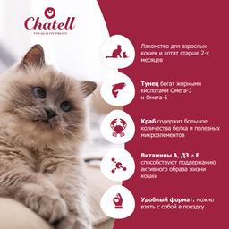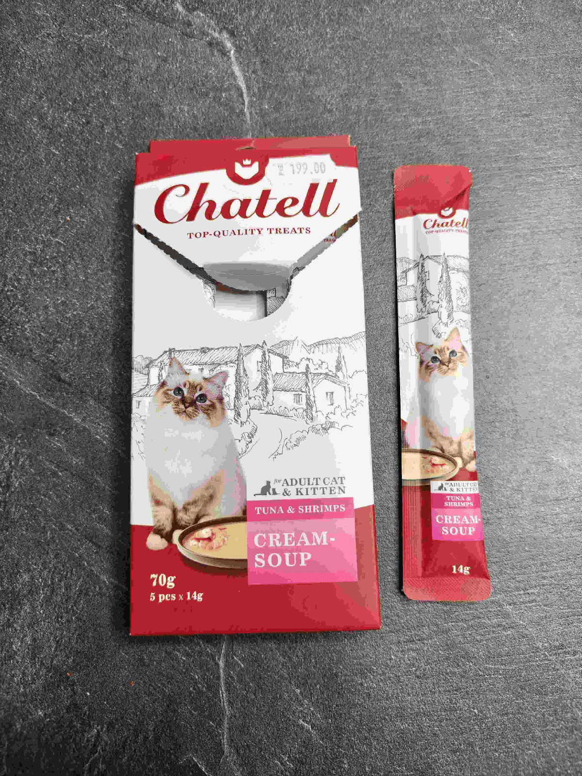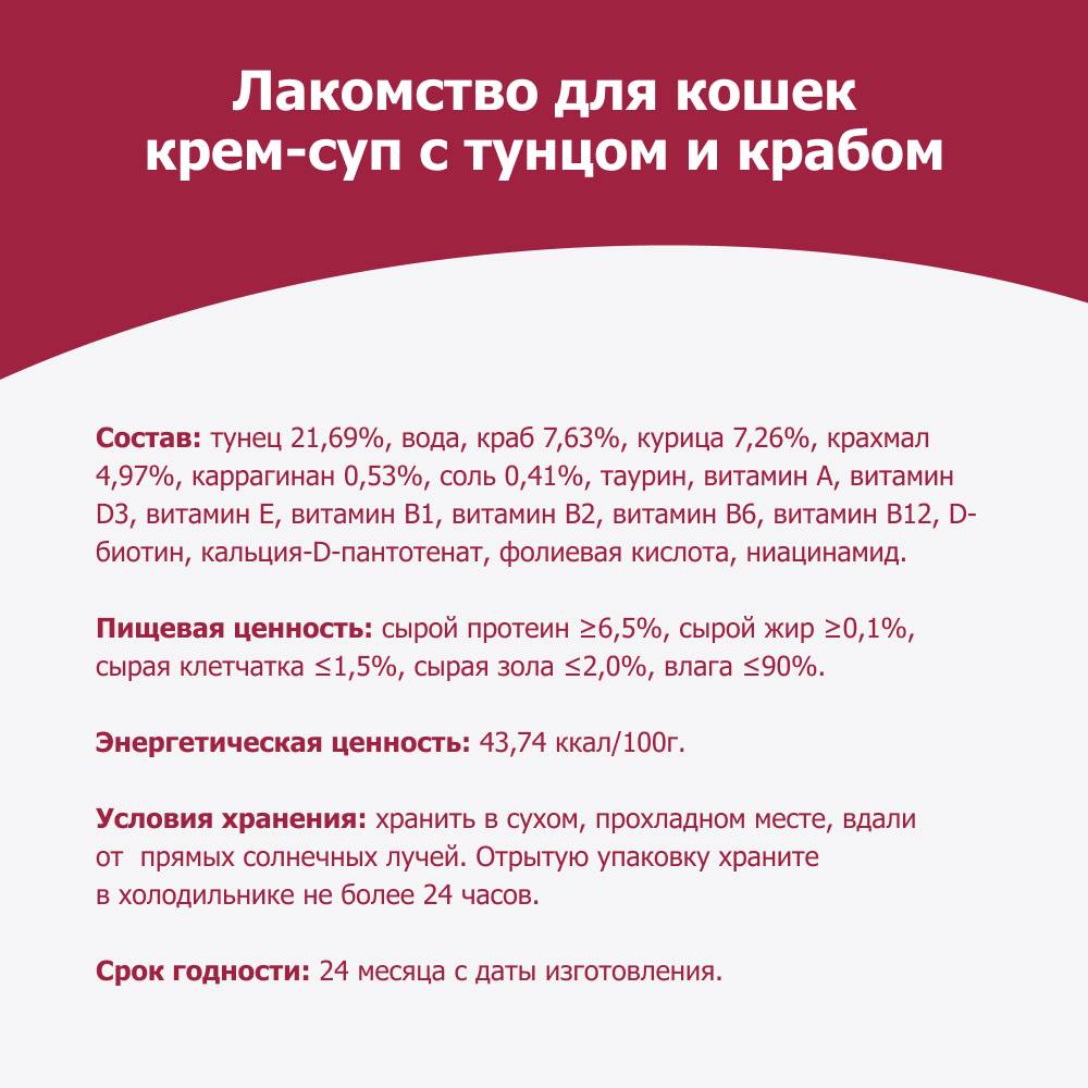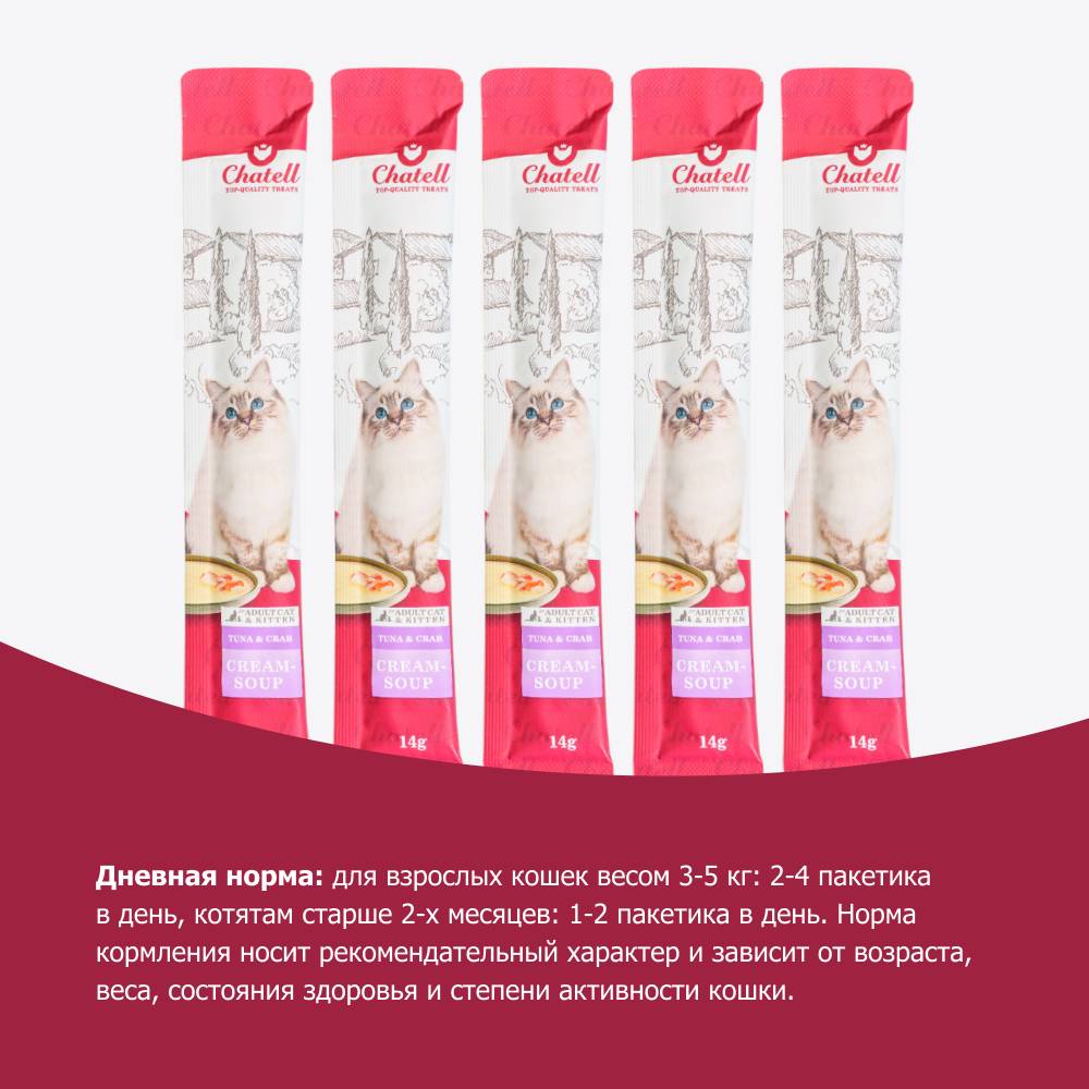 Chatell Крем-суп с тунцом и крабом – вкуснейшее лакомство для взрослых кошек и котят старше 2-x месяцев. Является дополнением к основному рациону питомца. Отлично подойдет в качестве поощрения.