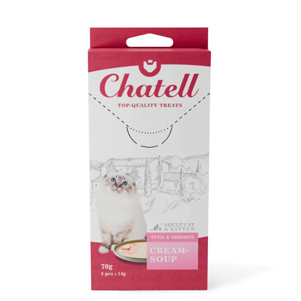 Chatell Крем-суп с тунцом и креветками – вкуснейшее лакомство для взрослых кошек и котят старше 2-x месяцев. Является дополнением к основному рациону питомца. Отлично подойдет в качестве поощрения.
