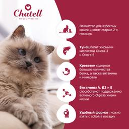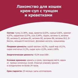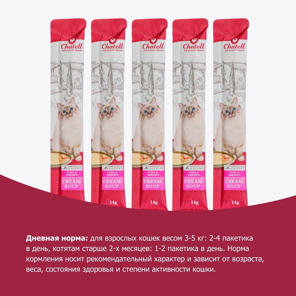 Chatell Крем-суп с тунцом и креветками – вкуснейшее лакомство для взрослых кошек и котят старше 2-x месяцев. Является дополнением к основному рациону питомца. Отлично подойдет в качестве поощрения.