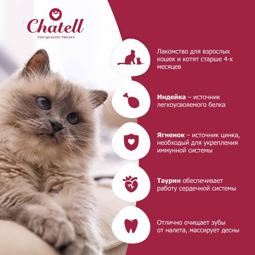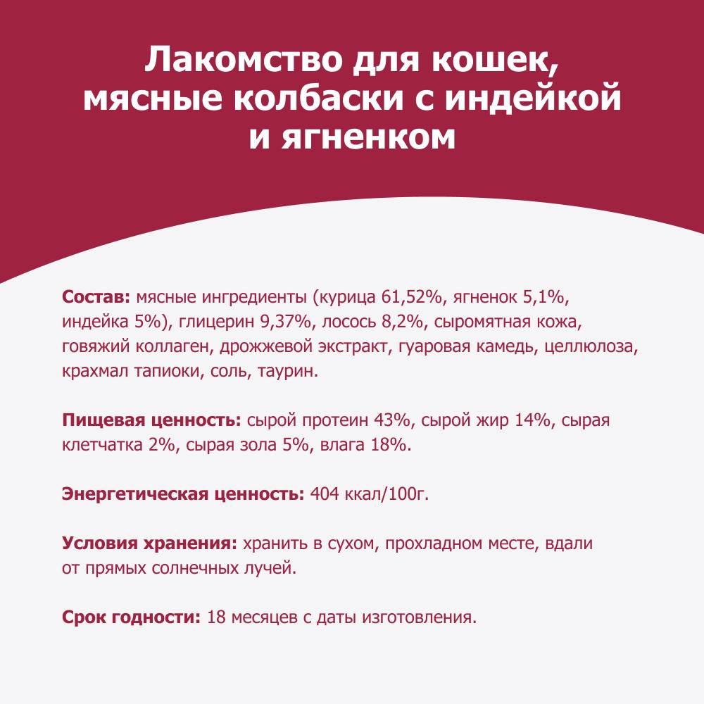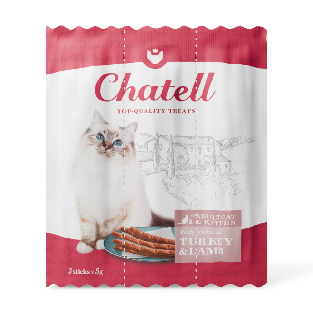 Chatell Мясные колбаски с индейкой и ягненком – лакомство для взрослых кошек и котят старше 4-х месяцев. Является дополнением к основному рациону питомца. Отлично подойдет в качестве поощрения.