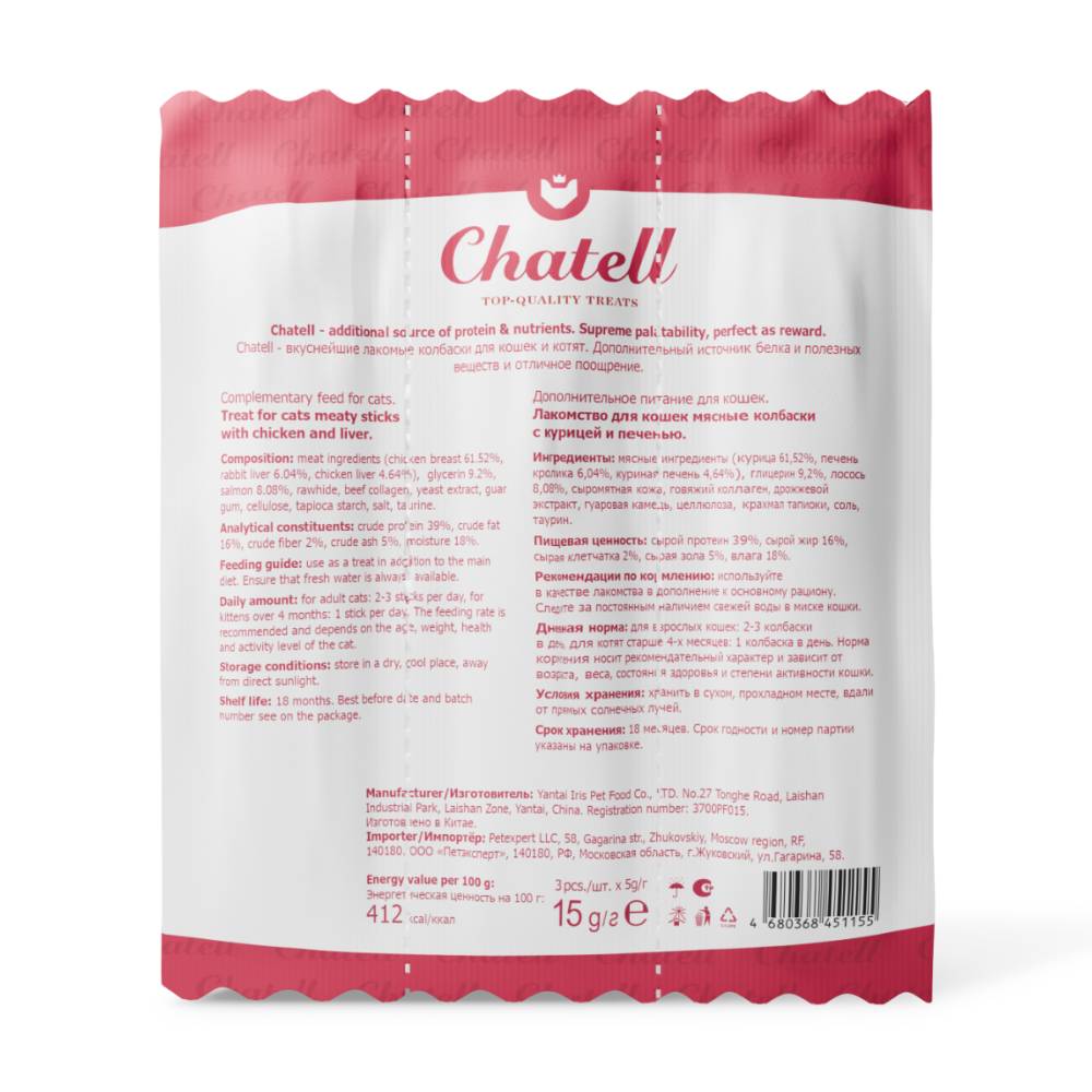 Chatell Мясные колбаски с курицей и печенью – лакомство для взрослых кошек и котят старше 4-х месяцев. Является дополнением к основному рациону питомца. Отлично подойдет в качестве поощрения.