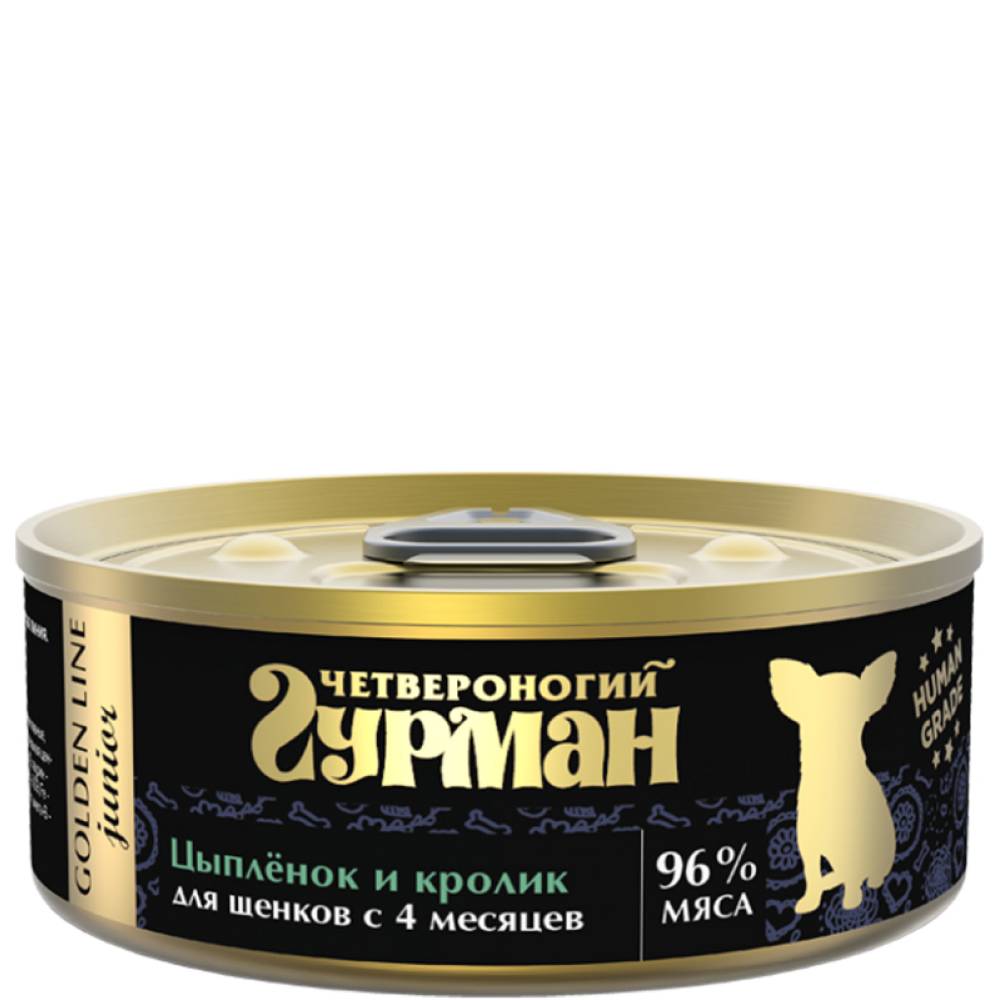 Консервированный корм Четвероногий Гурман Golden line Цыпленок и кролик в желе для щенков любой породы. Кусочки натурального мяса цыпленка и кролика в воздушном желе не вызовут у маленького питомца аллергической реакции или несварения. Учитывая значительные потребности в питательных элементах, рецептура обогащена минерально-витаминным комплексом. Постоянное употребление способствует здоровому формированию и росту.