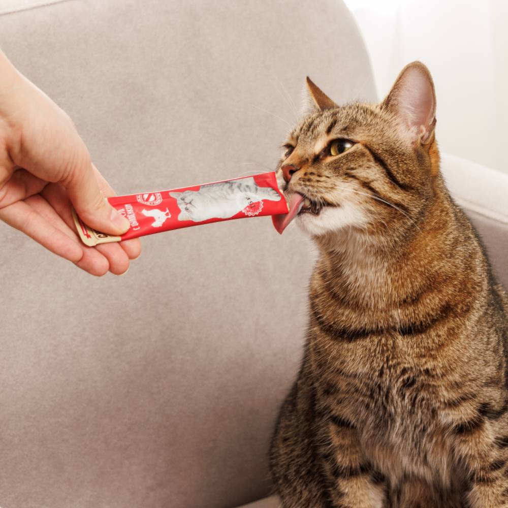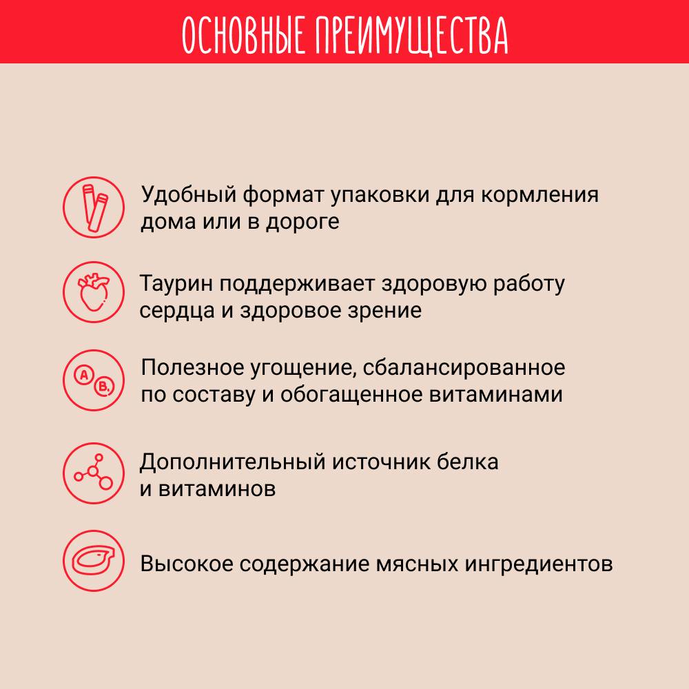 - Удобный формат упаковки для кормления дома или в дороге: кошка может слизывать лакомство из миски или прямо из пакетика.