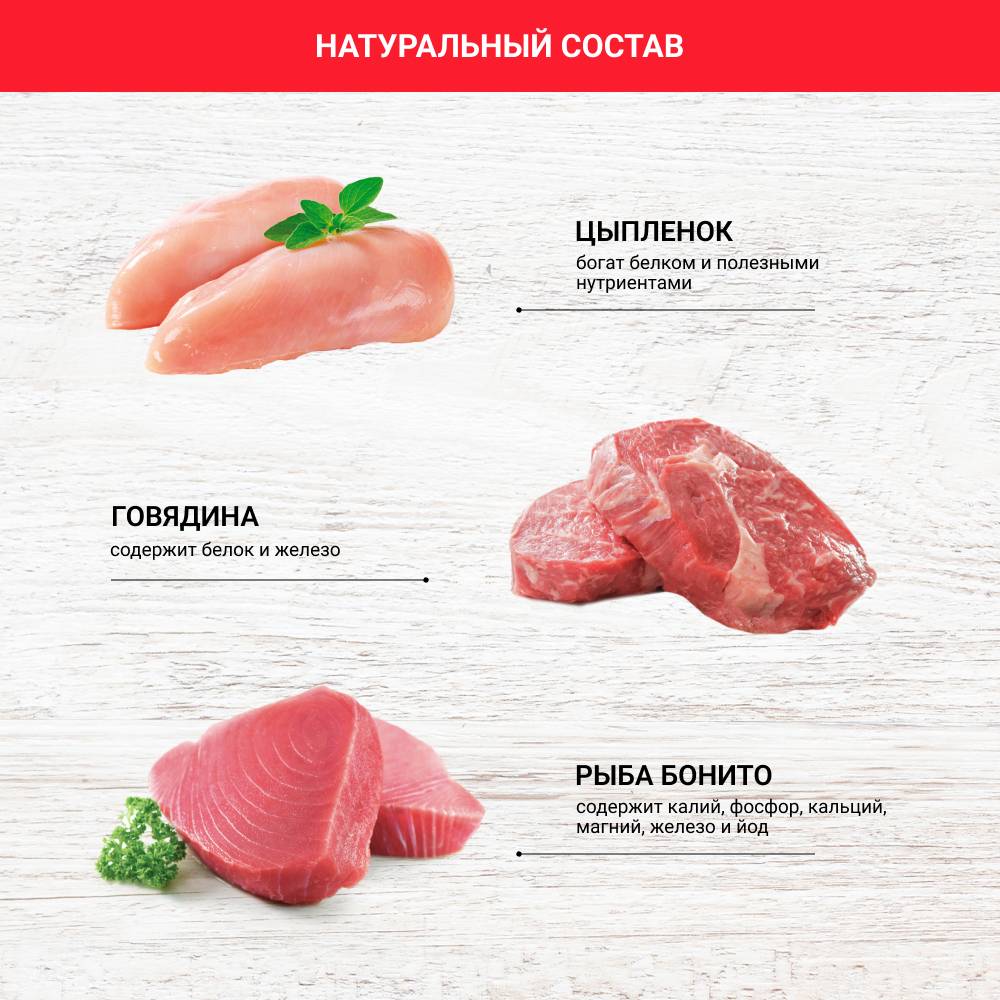- Высокое содержание мясных ингредиентов делает его сытным, но низкокалорийным – идеальное сочетание, если вы хотите побаловать своего питомца без вреда для фигуры.