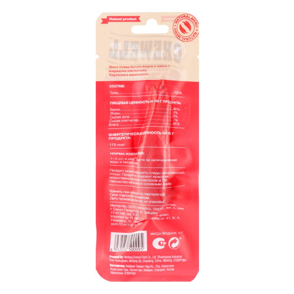 Коту понравился куриный кусок (так как рыбу натуральную он не разу не пробовал), тунец съела собака. Просто кусочки мяса на пару. Цена конечно не дорогая, но по сути очень не выгодное лакомство. Были бы такие кусочки в большой пачке и по более выгодной цене, брала бы постоянно. В целом всем советую, питомцы оценят, думаю попросят добавки.Достоинства