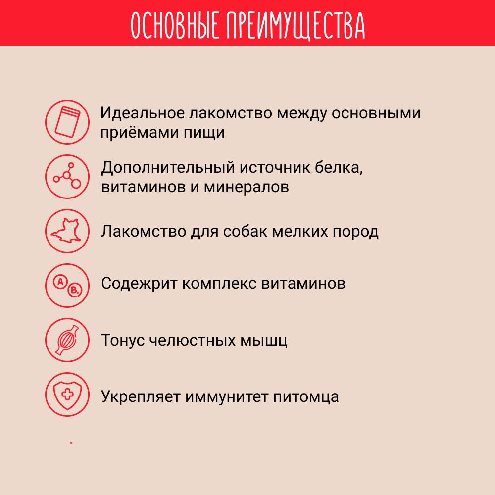 Особый состав питает кожу питательными элементами, минералами и витаминами, делая шерстку питомца любого возраста шелковистой и блестящей. Рекомендовано в качестве дополнительного блюда, поощрения, дрессуры.