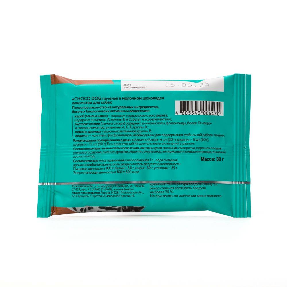 «CHOCO DOG® печенье в молочном шоколаде» - лакомство для собак представляет собой дополнительный функциональный корм для непродуктивных животных, предназначенный для использования в качестве лакомства с целью поощрения и дрессуры животных. Корм оказывает позитивное влияние практически на все системы организма. Печенье в шоколаде не содержит сахара, теобромина и кофеина, не вызывает аллергии.