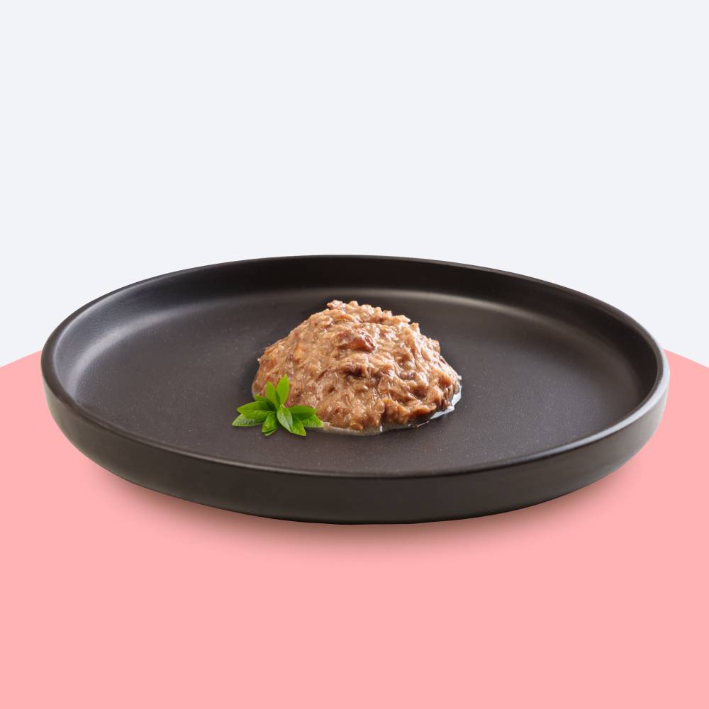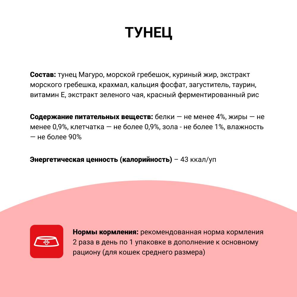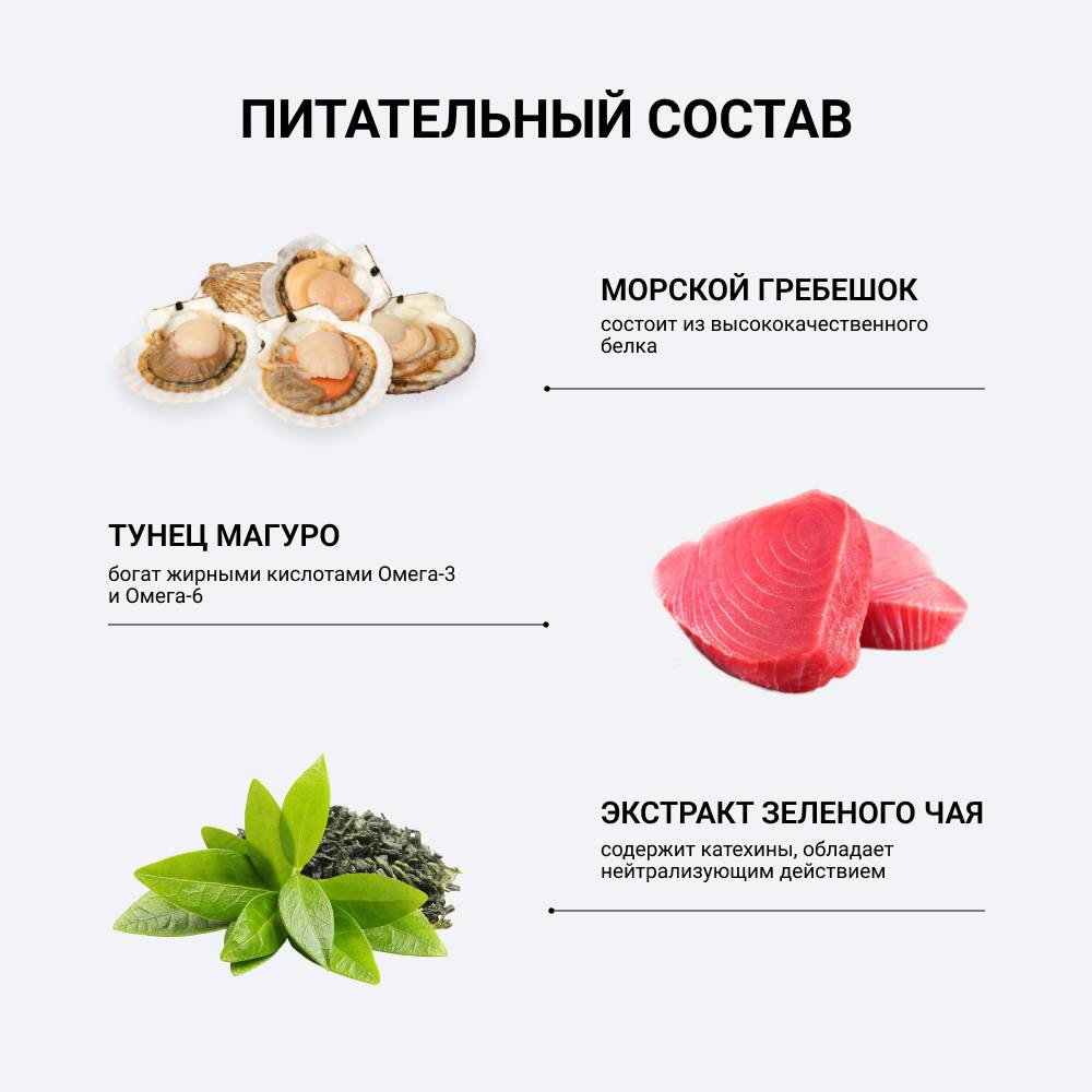 тунец Магуро, морской гребешок, куриный жир, экстракт морского гребешка, крахмал, кальция фосфат, загуститель, таурин, витамин Е, экстракт зеленого чая, красный ферментированный рис.