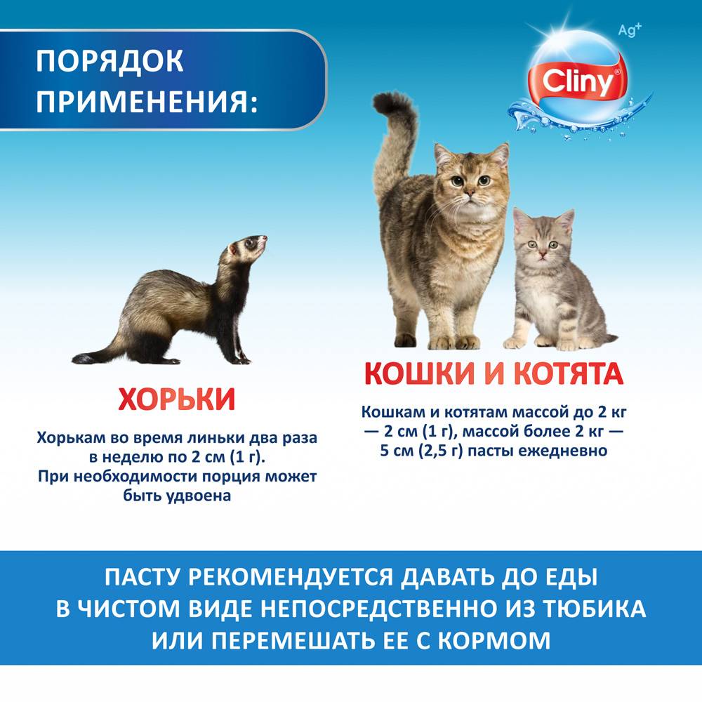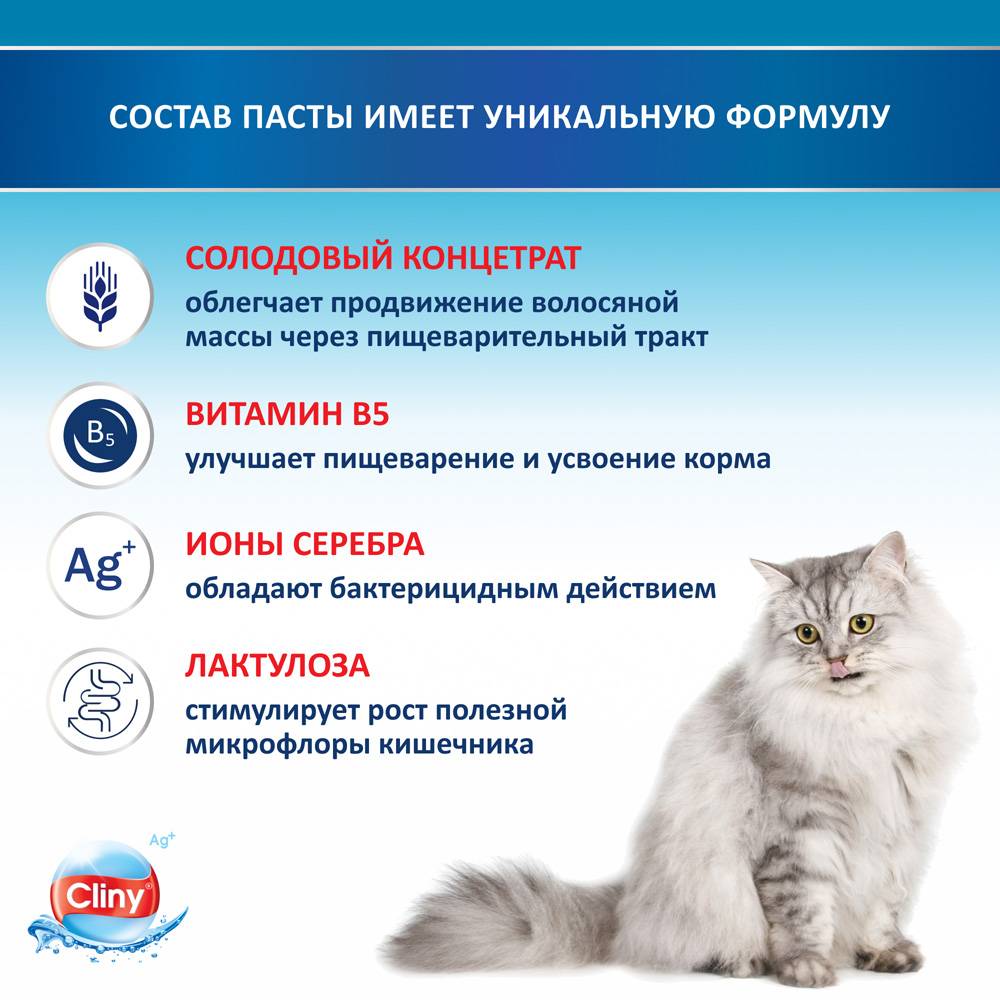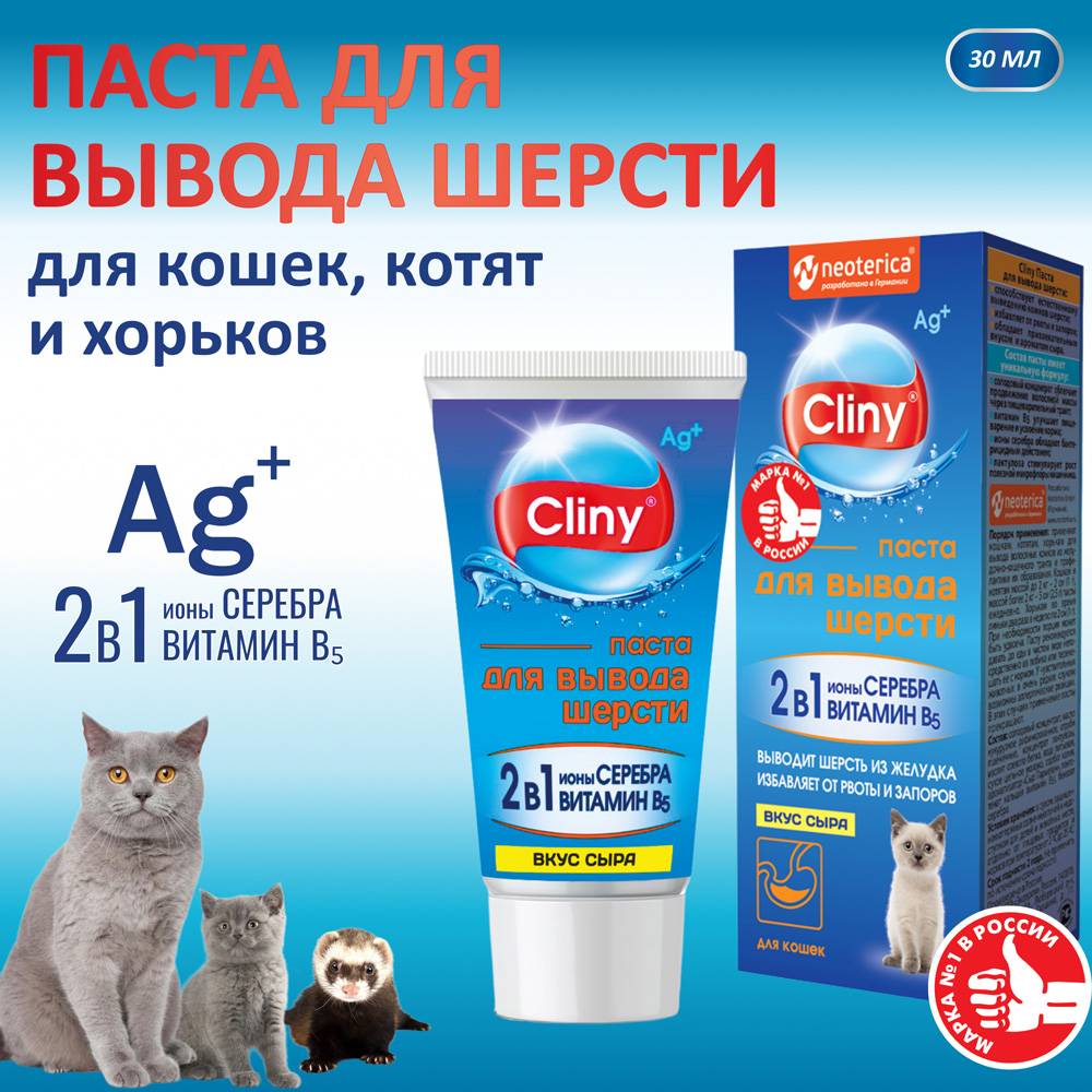 Паста для вывода шерсти Cliny способствует естественному выведению комков шерсти (безоаров) из желудка животных.