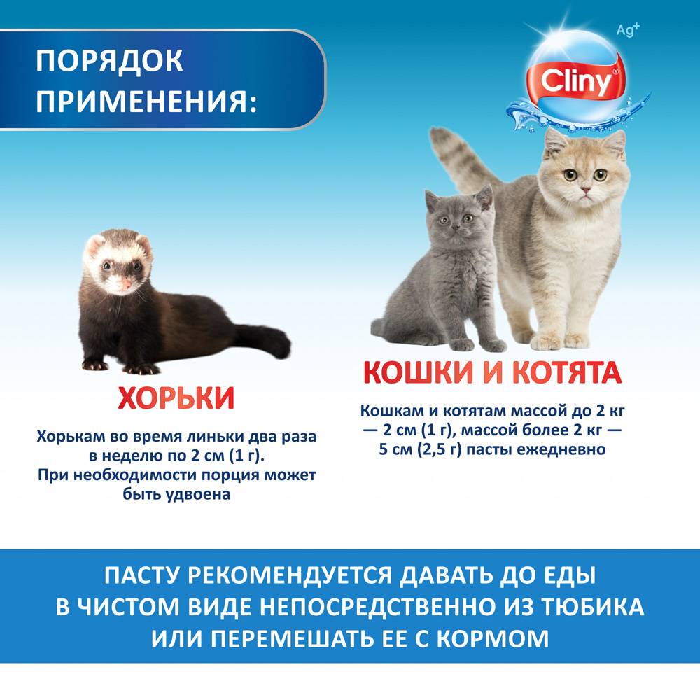 Кошкам и котятам массой до 2 кг — 2 см (1 г), массой более 2 кг — 5 см (2,5 г) пасты ежедневно.