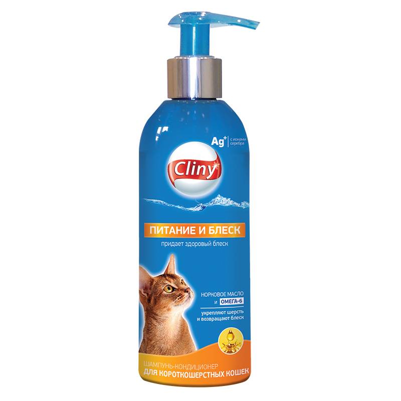 Cliny Шампунь-кондиционер для короткошерстных кошек питает и укрепляет кожно-волосяной покров, придает здоровый блеск и упругость.
