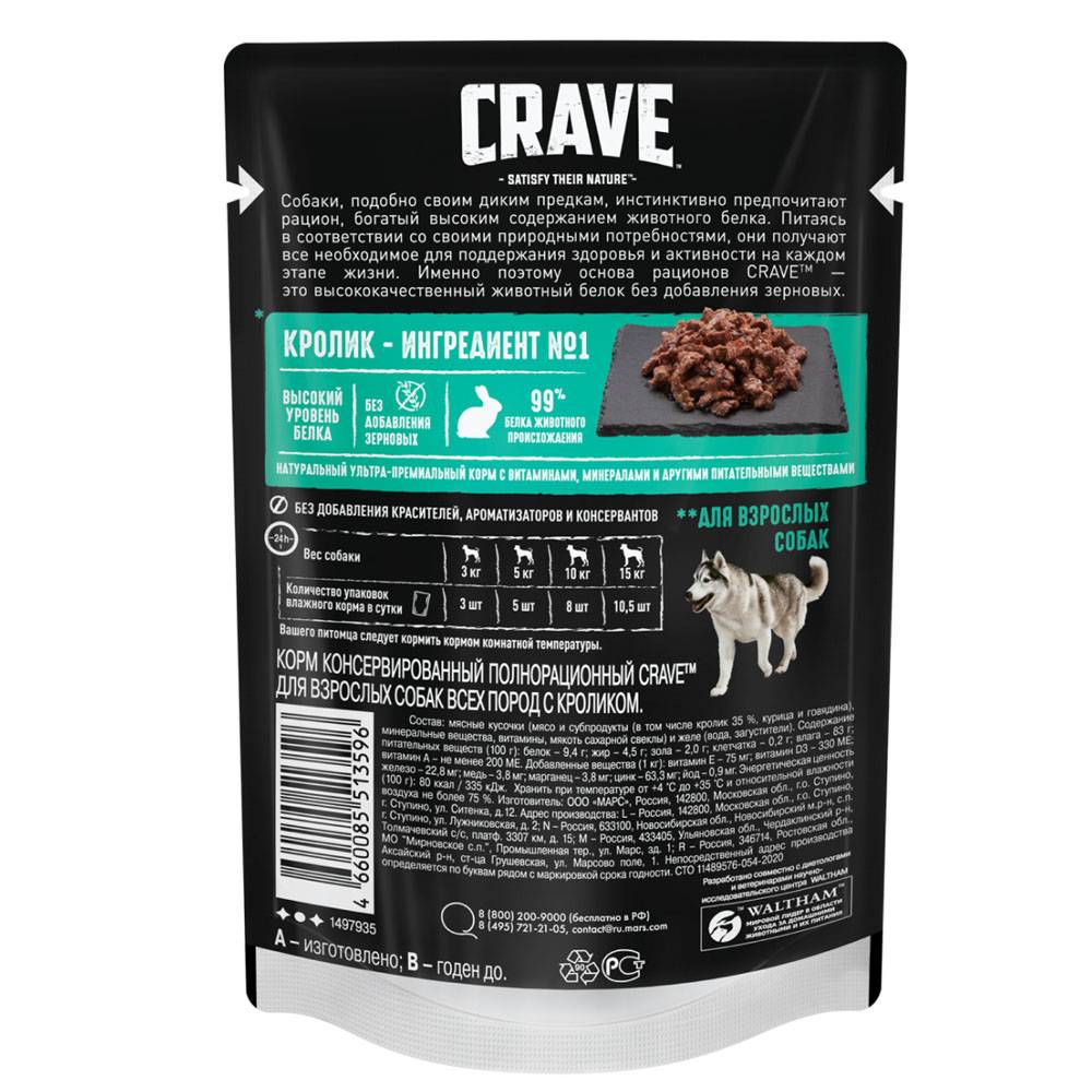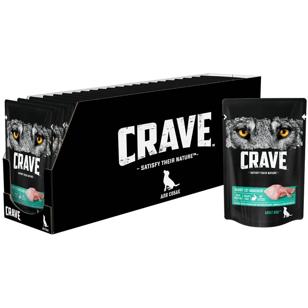 Crave Влажный корм (пауч) полнорационный для собак всех пород старше 1 года, с кроликом, 85 гр.