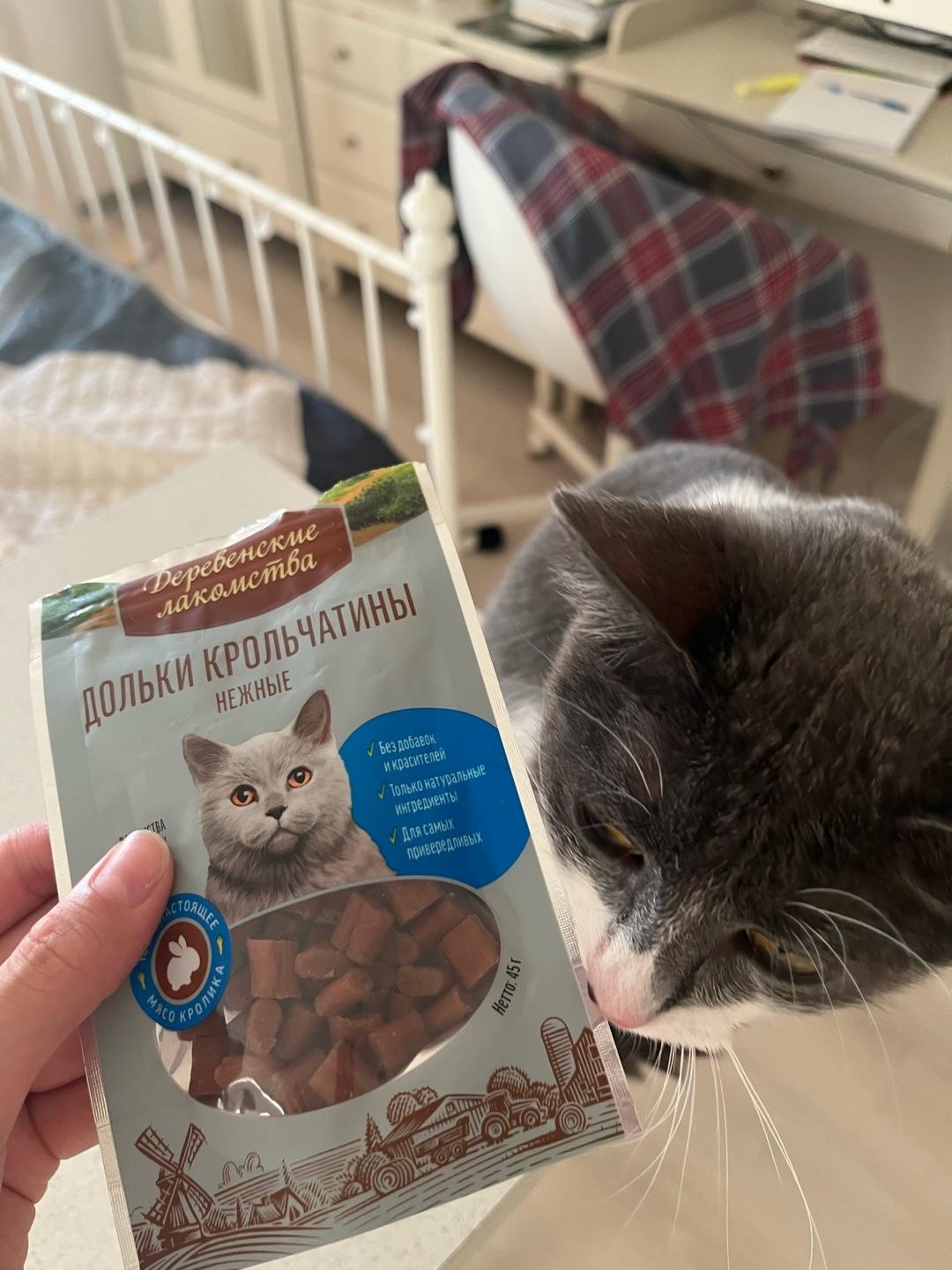 Кошка с ума сходит от этих вкусняшек, она вообще привередливая и ест даже вкусняхи очень выборочно, но конкретно эти кроличьи кусочки она обожает.Мария