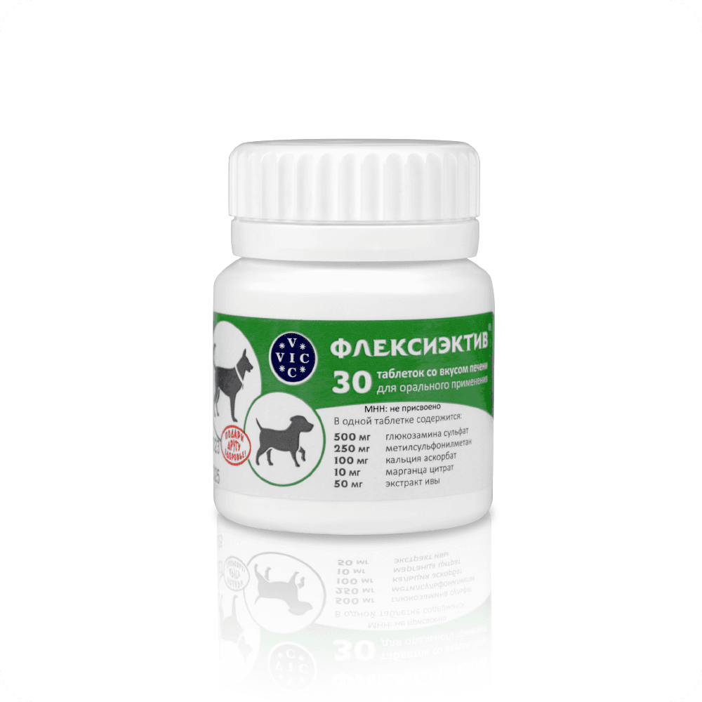 ФЛЕКСИЭКТИВ – комбинированный лекарственный препарат, обладающий противовоспалительным и хондропротекторным действием. Для профилактики и лечения острых и хронических заболеваний ОДА у собак (артрита, артроза, остеоартрита, остеоартроза, остеохондроза, остеохондропатии, остеопороза, дисплазии суставов); для снятия боли любой этиологии при необходимости длительного курса лечения; для собак старше 6 лет; при повышенных нагрузках на выставках, соревнованиях, охоте; перед и после операций на ОДА; после лечения фторхинолонами; для профилактики заболеваний кровеносных сосудов. Уникальный состав: Экстракт ивы – природный НПВС, анальгетик, укрепляет сосуды. Глюкозамин – увеличивает проницаемость суставной капсулы для питательных веществ, восстанавливает прочность и эластичность суставного хряща. Комплекс МСМ (метилсульфанилметан)- источник биодоступной серы для синтеза коллагена. Кальция аскорбат- источник биодоступного кальция, участвует в синтезе коллагена. Марганца цитрат - участвует в остеосинтезе и усвоении хондроитина. При комплексном лечении заболеваний ОДА рекомендован в подострый период болезни. Удобная экономичная дозировка: собакам до 5 кг лечение -1/2 т, профилактика - 1/4; от 5 до 15 кг - 1 т.,/ 1/2 т.; от 15 до 30 кг 2 т. / 1т. более 30 кг 3т./ 2т.;