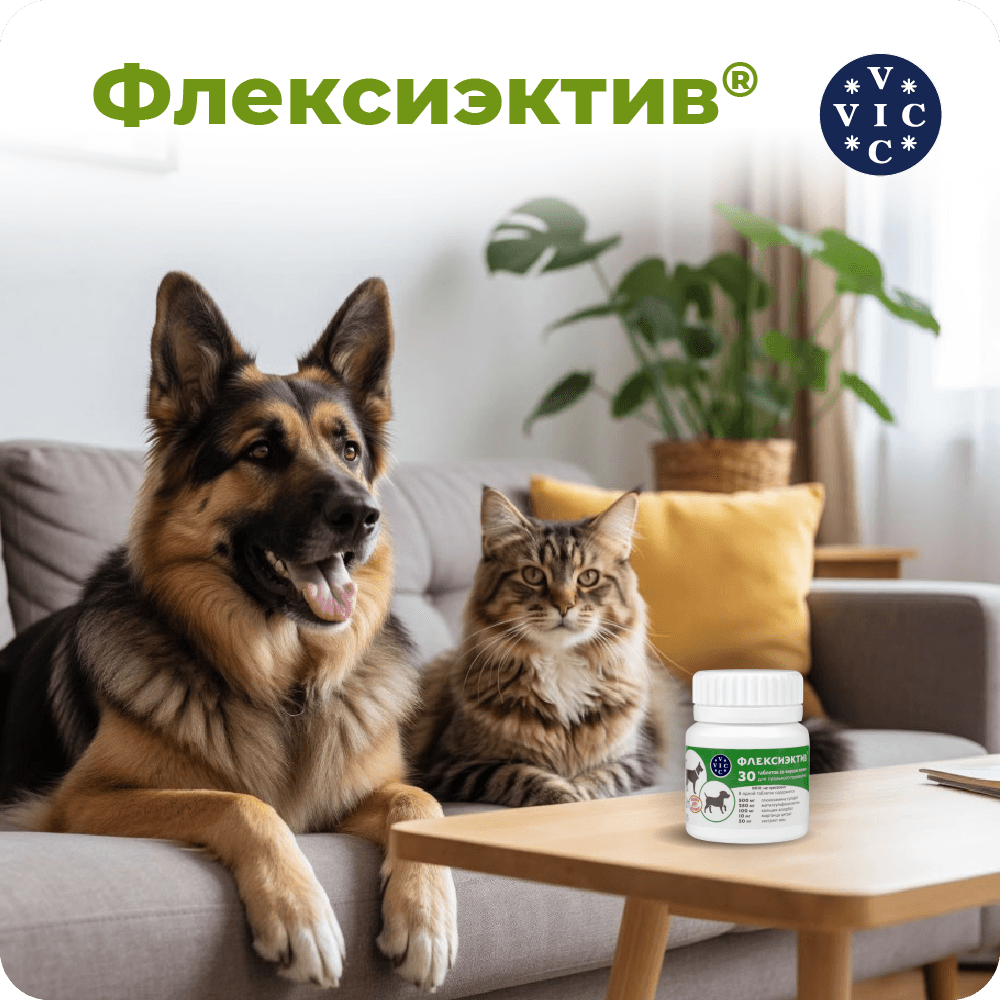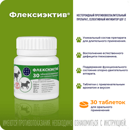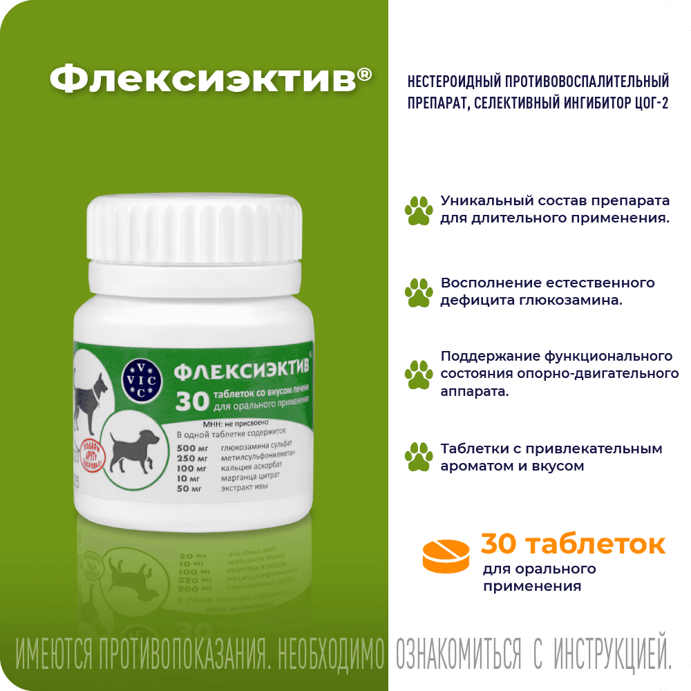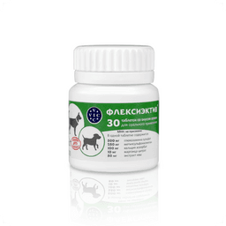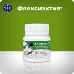 ФЛЕКСИЭКТИВ – комбинированный лекарственный препарат, обладающий противовоспалительным и хондропротекторным действием. Для профилактики и лечения острых и хронических заболеваний ОДА у собак (артрита, артроза, остеоартрита, остеоартроза, остеохондроза, остеохондропатии, остеопороза, дисплазии суставов); для снятия боли любой этиологии при необходимости длительного курса лечения; для собак старше 6 лет; при повышенных нагрузках на выставках, соревнованиях, охоте; перед и после операций на ОДА; после лечения фторхинолонами; для профилактики заболеваний кровеносных сосудов. Уникальный состав: Экстракт ивы – природный НПВС, анальгетик, укрепляет сосуды. Глюкозамин – увеличивает проницаемость суставной капсулы для питательных веществ, восстанавливает прочность и эластичность суставного хряща. Комплекс МСМ (метилсульфанилметан)- источник биодоступной серы для синтеза коллагена. Кальция аскорбат- источник биодоступного кальция, участвует в синтезе коллагена. Марганца цитрат - участвует в остеосинтезе и усвоении хондроитина. При комплексном лечении заболеваний ОДА рекомендован в подострый период болезни. Удобная экономичная дозировка: собакам до 5 кг лечение -1/2 т, профилактика - 1/4; от 5 до 15 кг - 1 т.,/ 1/2 т.; от 15 до 30 кг 2 т. / 1т. более 30 кг 3т./ 2т.;