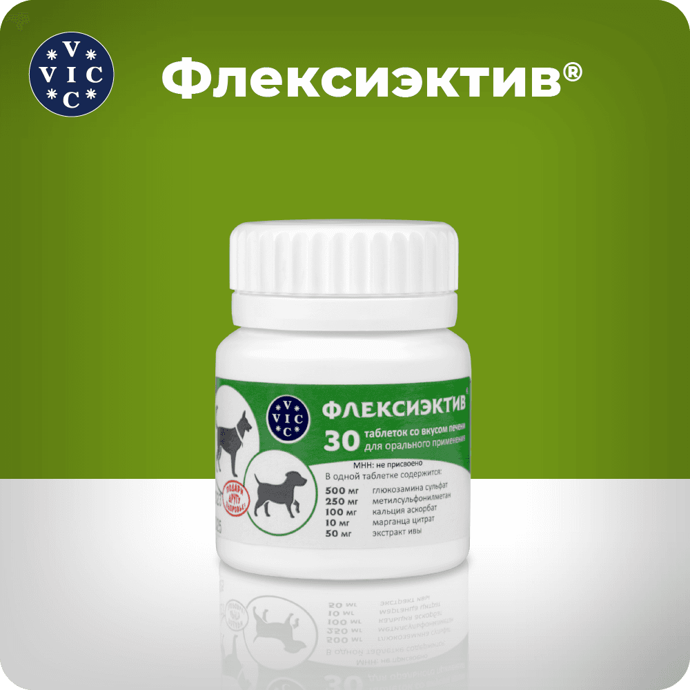 Вик – здоровье животных VIC Флексиэктив Таблетки для лечения заболеваний опорно-двигательного аппарата у собак старше 6 лет, со вкусом печени, 30 таблеток