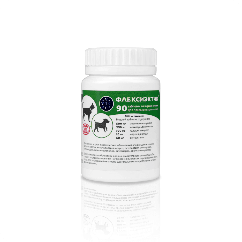 ФЛЕКСИЭКТИВ – комбинированный лекарственный препарат, обладающий противовоспалительным и хондропротекторным действием. Для профилактики и лечения острых и хронических заболеваний ОДА у собак (артрита, артроза, остеоартрита, остеоартроза, остеохондроза, остеохондропатии, остеопороза, дисплазии суставов); для снятия боли любой этиологии при необходимости длительного курса лечения; для собак старше 6 лет; при повышенных нагрузках на выставках, соревнованиях, охоте; перед и после операций на ОДА; после лечения фторхинолонами; для профилактики заболеваний кровеносных сосудов. Уникальный состав: Экстракт ивы – природный НПВС, анальгетик, укрепляет сосуды. Глюкозамин – увеличивает проницаемость суставной капсулы для питательных веществ, восстанавливает прочность и эластичность суставного хряща. Комплекс МСМ (метилсульфанилметан)- источник биодоступной серы для синтеза коллагена. Кальция аскорбат- источник биодоступного кальция, участвует в синтезе коллагена. Марганца цитрат - участвует в остеосинтезе и усвоении хондроитина. При комплексном лечении заболеваний ОДА рекомендован в подострый период болезни. Удобная экономичная дозировка: собакам до 5 кг лечение -1/2 т, профилактика - 1/4; от 5 до 15 кг - 1 т.,/ 1/2 т.; от 15 до 30 кг 2 т. / 1т. более 30 кг 3т./ 2т.;Курс лечения – от 30 до 90 суток в зависимости от тяжести заболевания. После 30 дней приема, в случае выраженной положительной динамики, возможен переход на половинную дозу. Для профилактики заболеваний опорно-двигательного аппарата у собак старше 6 лет таблетки ФЛЕКСИЭКТИВ® применяют курсами по 30 суток.
