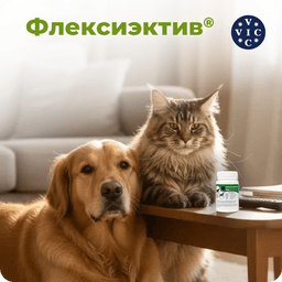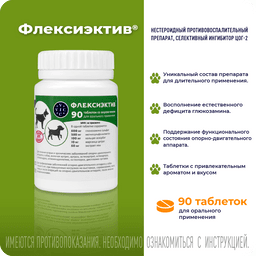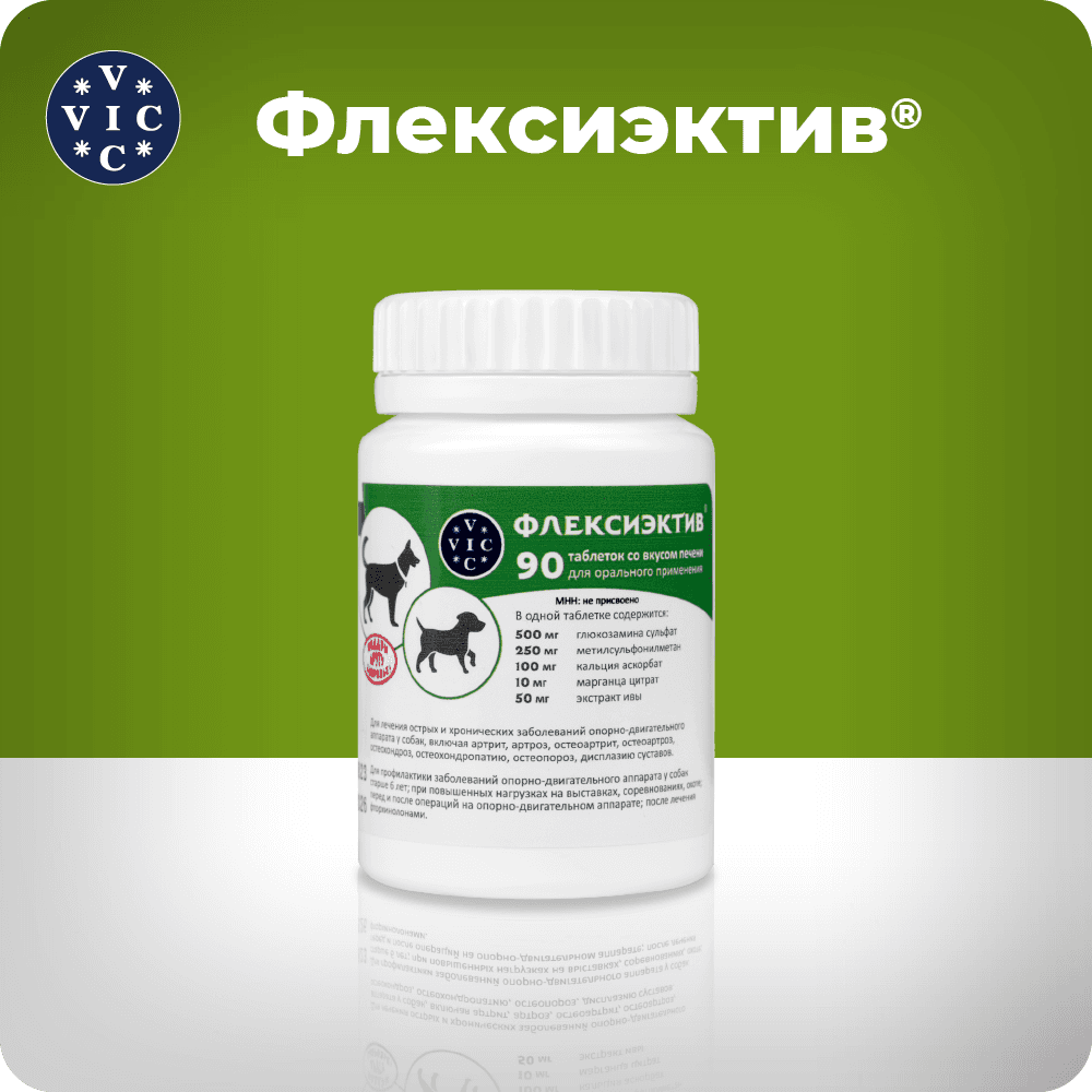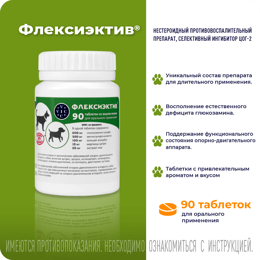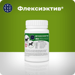 ФЛЕКСИЭКТИВ – комбинированный лекарственный препарат, обладающий противовоспалительным и хондропротекторным действием. Для профилактики и лечения острых и хронических заболеваний ОДА у собак (артрита, артроза, остеоартрита, остеоартроза, остеохондроза, остеохондропатии, остеопороза, дисплазии суставов); для снятия боли любой этиологии при необходимости длительного курса лечения; для собак старше 6 лет; при повышенных нагрузках на выставках, соревнованиях, охоте; перед и после операций на ОДА; после лечения фторхинолонами; для профилактики заболеваний кровеносных сосудов. Уникальный состав: Экстракт ивы – природный НПВС, анальгетик, укрепляет сосуды. Глюкозамин – увеличивает проницаемость суставной капсулы для питательных веществ, восстанавливает прочность и эластичность суставного хряща. Комплекс МСМ (метилсульфанилметан)- источник биодоступной серы для синтеза коллагена. Кальция аскорбат- источник биодоступного кальция, участвует в синтезе коллагена. Марганца цитрат - участвует в остеосинтезе и усвоении хондроитина. При комплексном лечении заболеваний ОДА рекомендован в подострый период болезни. Удобная экономичная дозировка: собакам до 5 кг лечение -1/2 т, профилактика - 1/4; от 5 до 15 кг - 1 т.,/ 1/2 т.; от 15 до 30 кг 2 т. / 1т. более 30 кг 3т./ 2т.;Курс лечения – от 30 до 90 суток в зависимости от тяжести заболевания. После 30 дней приема, в случае выраженной положительной динамики, возможен переход на половинную дозу. Для профилактики заболеваний опорно-двигательного аппарата у собак старше 6 лет таблетки ФЛЕКСИЭКТИВ® применяют курсами по 30 суток.