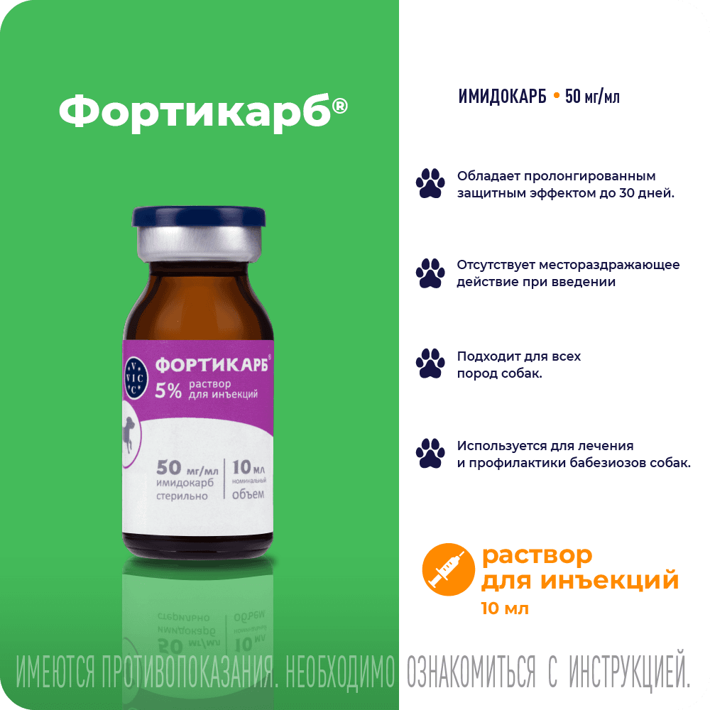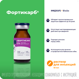 Собакам при бабезиозе вводят однократно внутримышечно или подкожно в дозе 4 мг/кг массы животного. В случае контрольного исследования крови через сутки после введения Фортикарб 5 % раствора для инъекций и выявление в ней бабезий, препарат вводят повторно в вышеуказанной дозе. С профилактической целью, при нападении или угрозе нападения клещей-переносчиков кровепаразитарных болезней, Фортикарб вводят однократно внутримышечно или подкожно в дозе 4 мг/кг массы животного. Защитный эффект наблюдается в течение 15 – 30 дней.