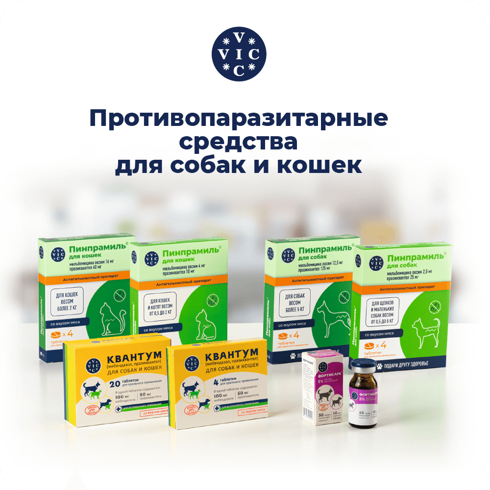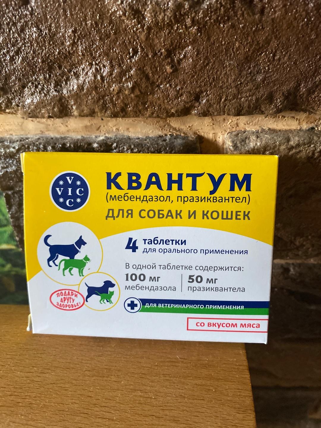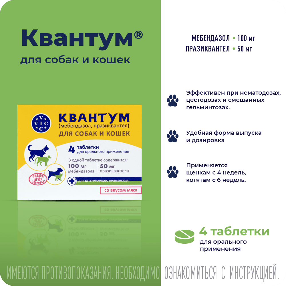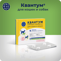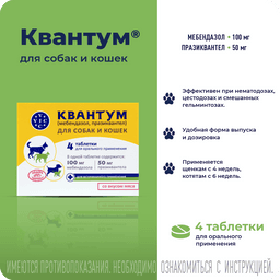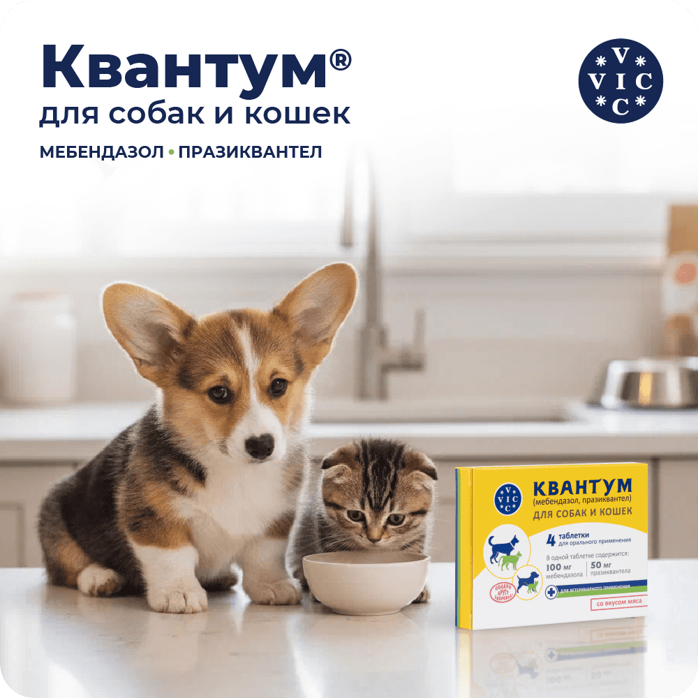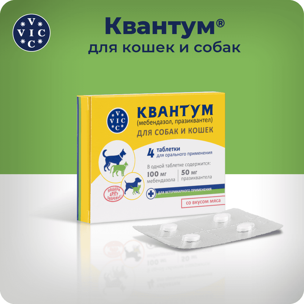 КВАНТУМ — уникальная комбинация ДВ (мебендазол+празиквантел), широкий спектр действия на все стадии развития круглых и ленточных гельминтов.