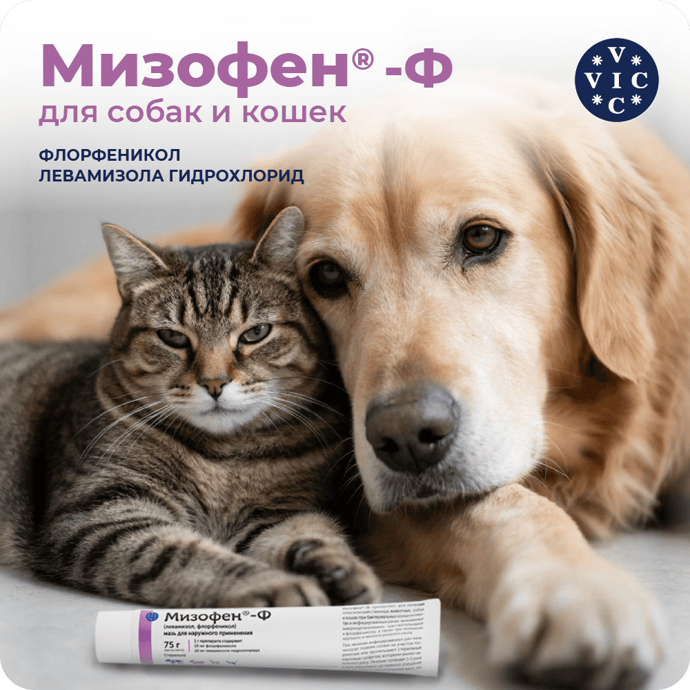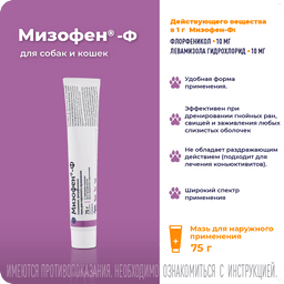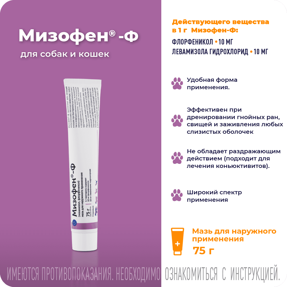 МИЗОФЕН®-Ф (Флорфеникол, левамизол). Мазь для лечения бактериальных и паразитарных конъюнктивитов и инфицированных ран, ожогов, обморожений, используется при дренировании гнойных ран и лечения поражений слизистых оболочек любой этиологии.