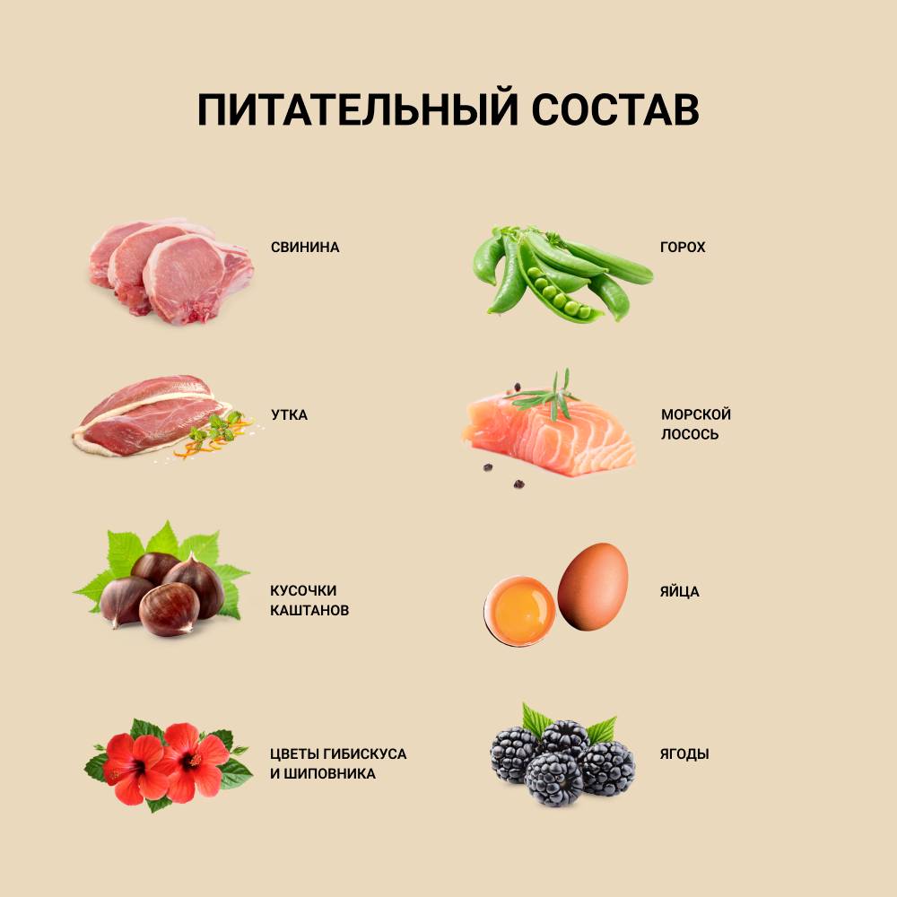 *70% –ингредиенты животного происхождения; 30% –растения, фрукты, овощи; 0% –злаки, картофель, тапиока