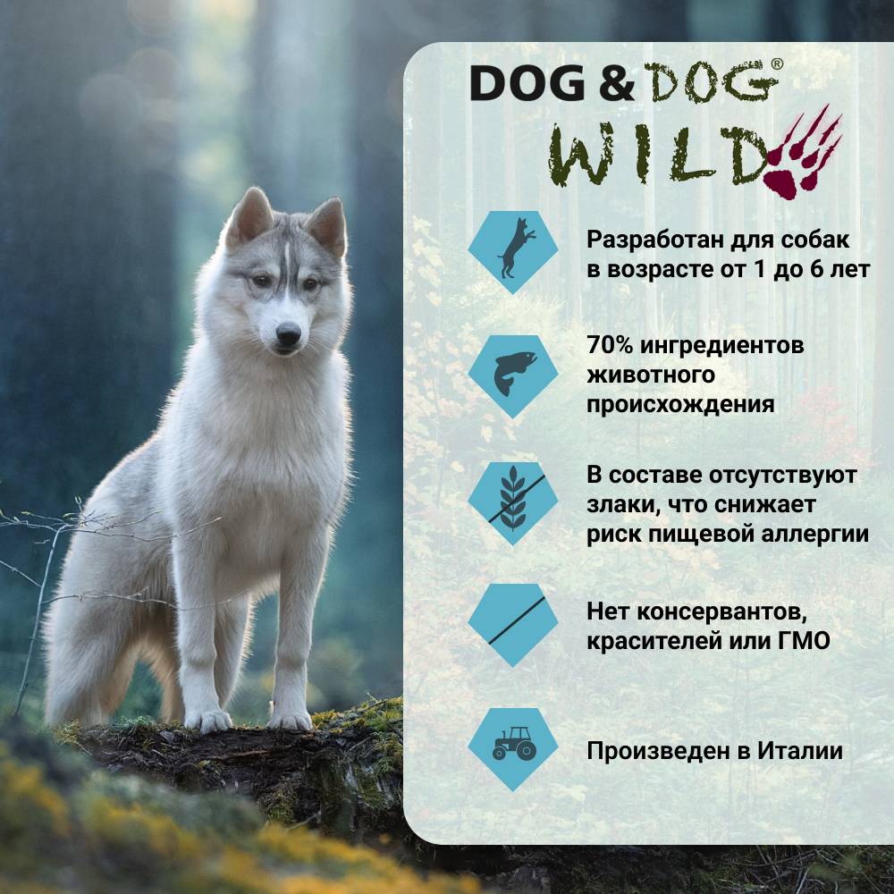 Dog & Dog WILD – линейка кормов, разработанная с учетом потребностей собак, заложенных природой. Через формулу 70%/30%/0%* корм предлагает такое же богатство и разнообразие мяса и рыбы, которые ежедневно дает природа, а также овощи, растения, ягоды и фрукты, за исключением таких компонентов, как злаки и растительные белки, которые не входят в естественный рацион собак.