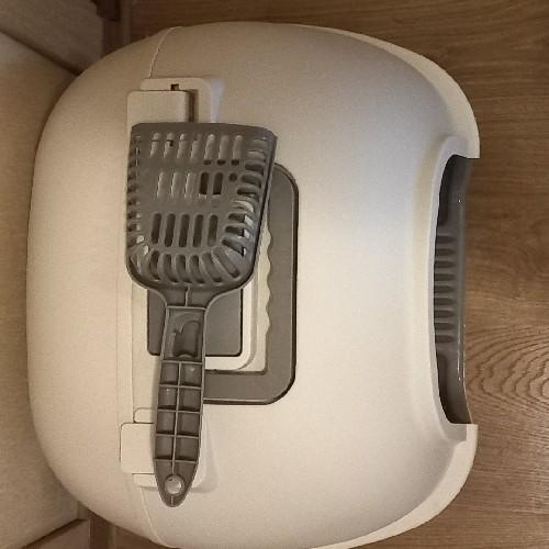 • главной отличительной чертой данной модели является то, что для уборки туалета теперь не надо снимать всю верхнюю крышку целиком или пытаться дотянуться через окошко, достаточно просто открыть заднюю часть крышки и весь лоток доступен для уборки, в закрытом состоянии задняя крышка фиксируется совком с крючком, что не позволит животному открыть крышку самостоятельно, совок входит в комплект;