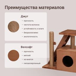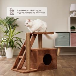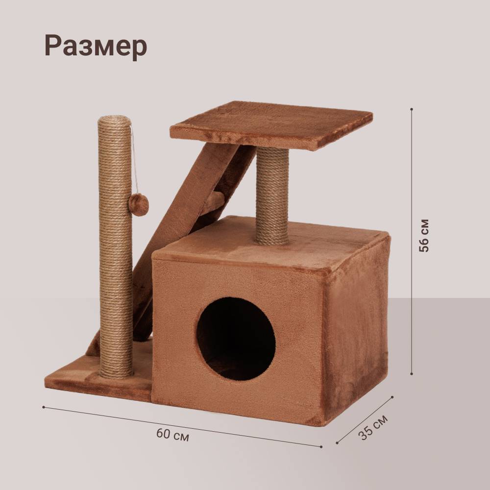 - В домике есть место для отдыха, когтеточка и лесенка.