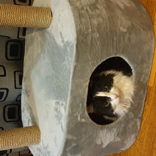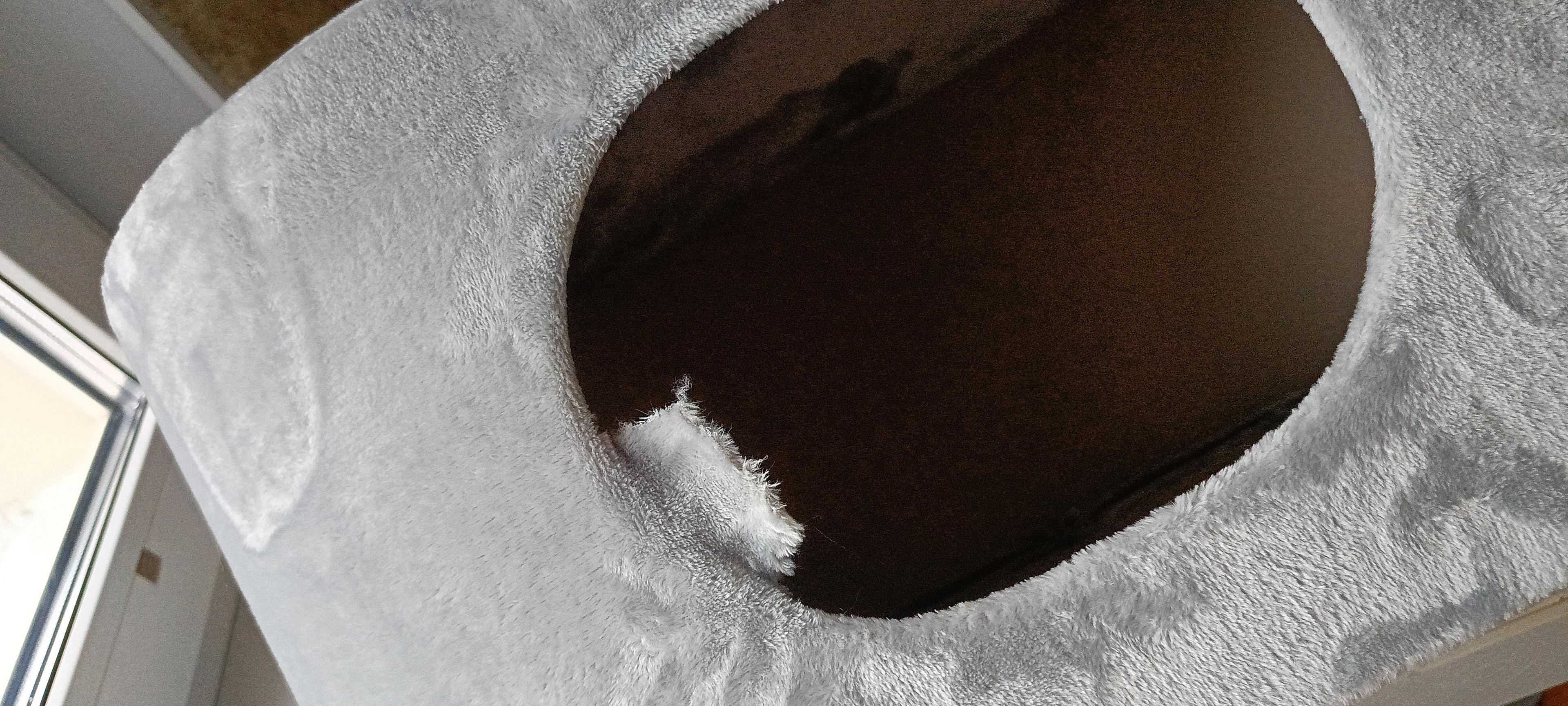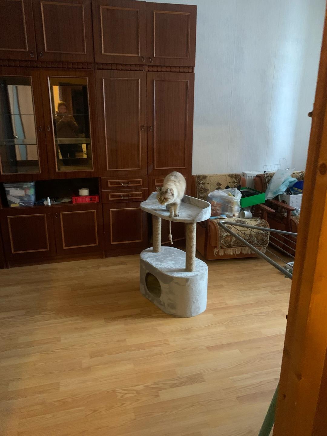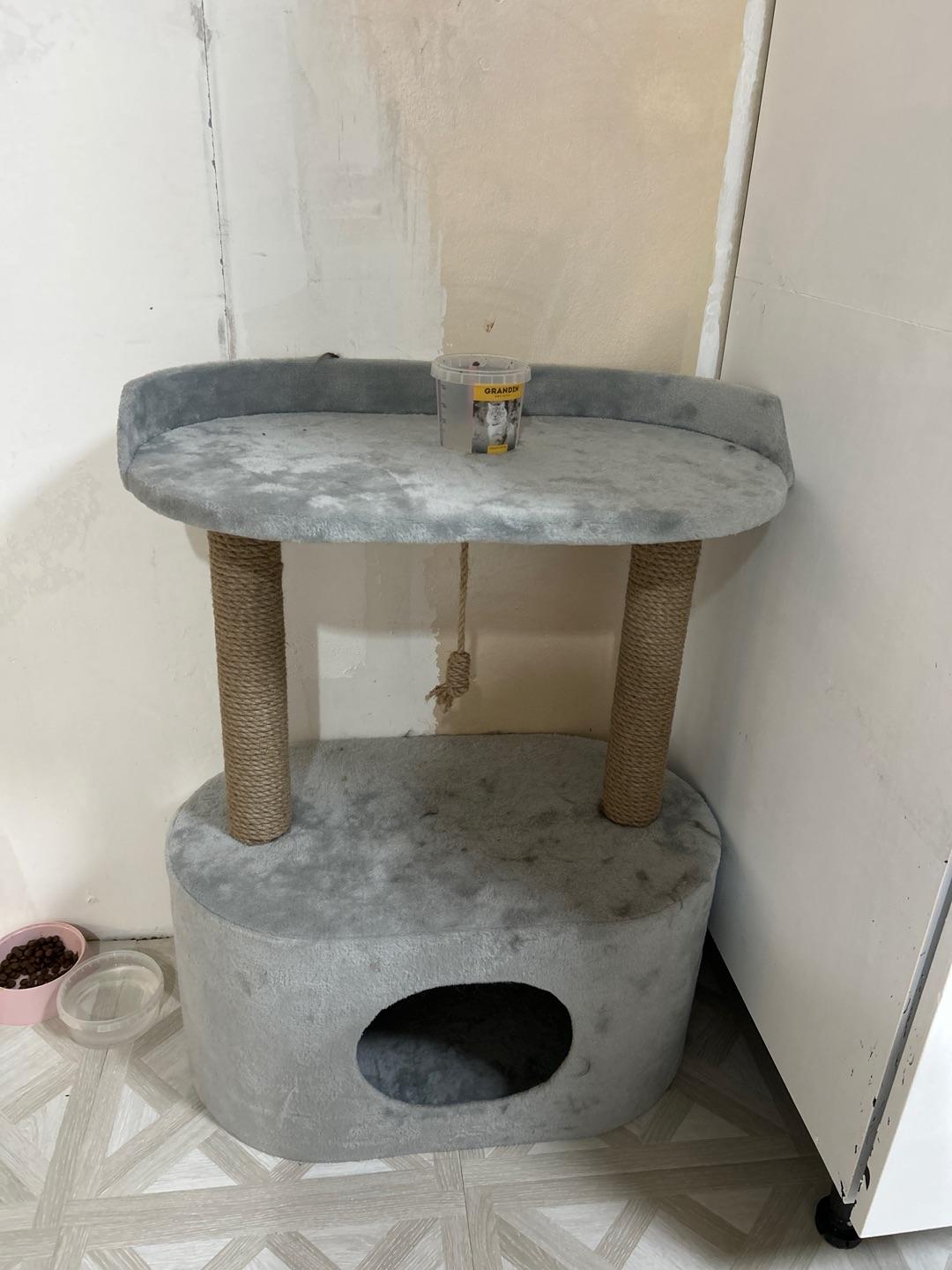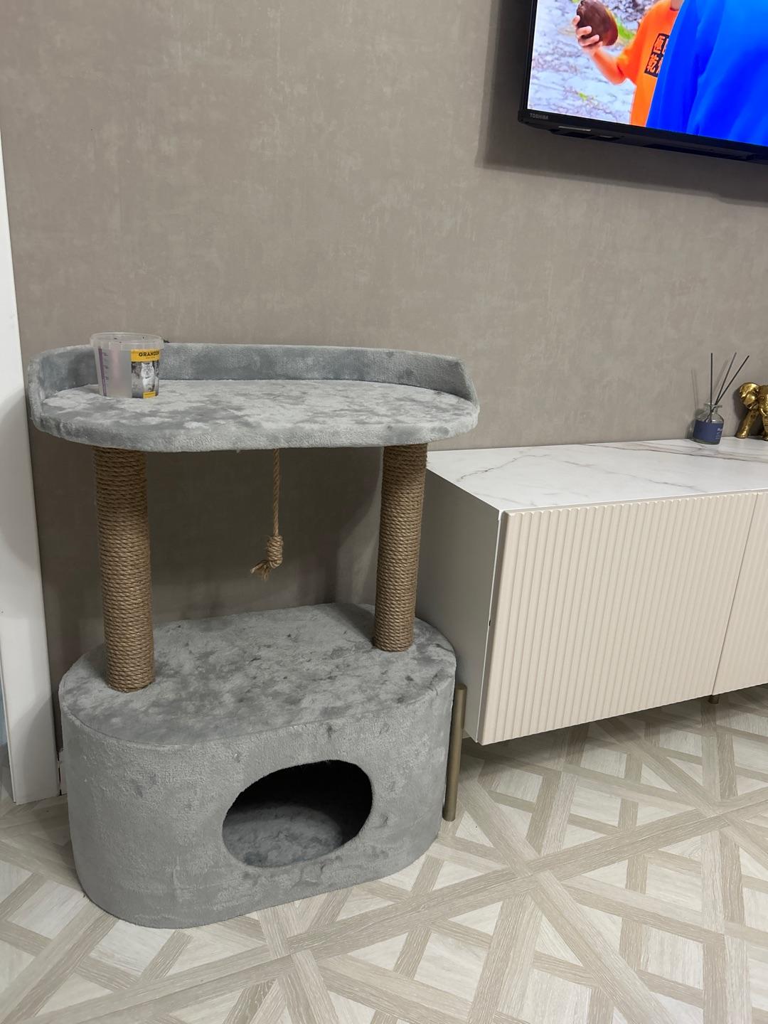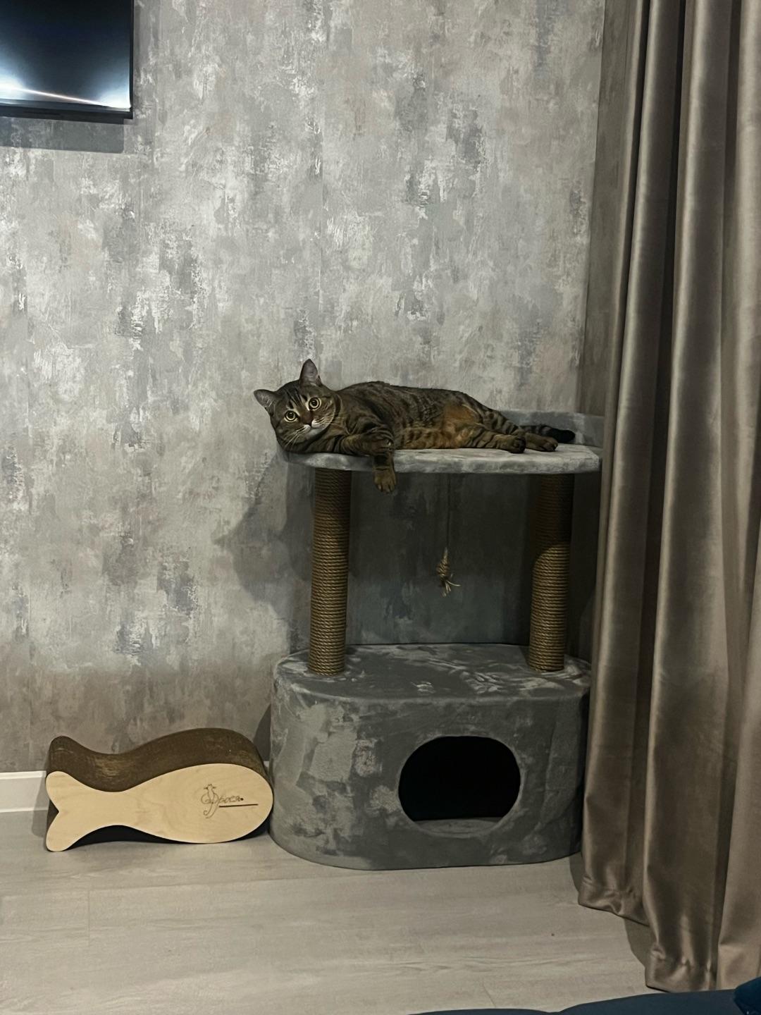 - В домике есть место для отдыха и когтеточка.