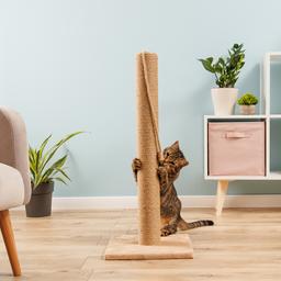Высокий, 80 см высотой, но компактный, не занимает много места. Столбик выполнен из натурального материала, в комплекте есть пакетик с кошачьей мятой для привлечения внимания кошки (я им не пользовалась). Сбоку висит джутовый шнур с узлом, которым кошка играет как игрушкой.