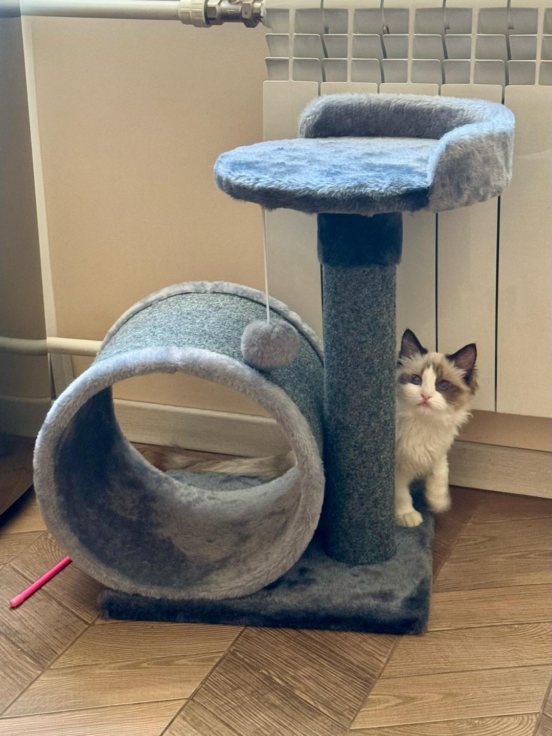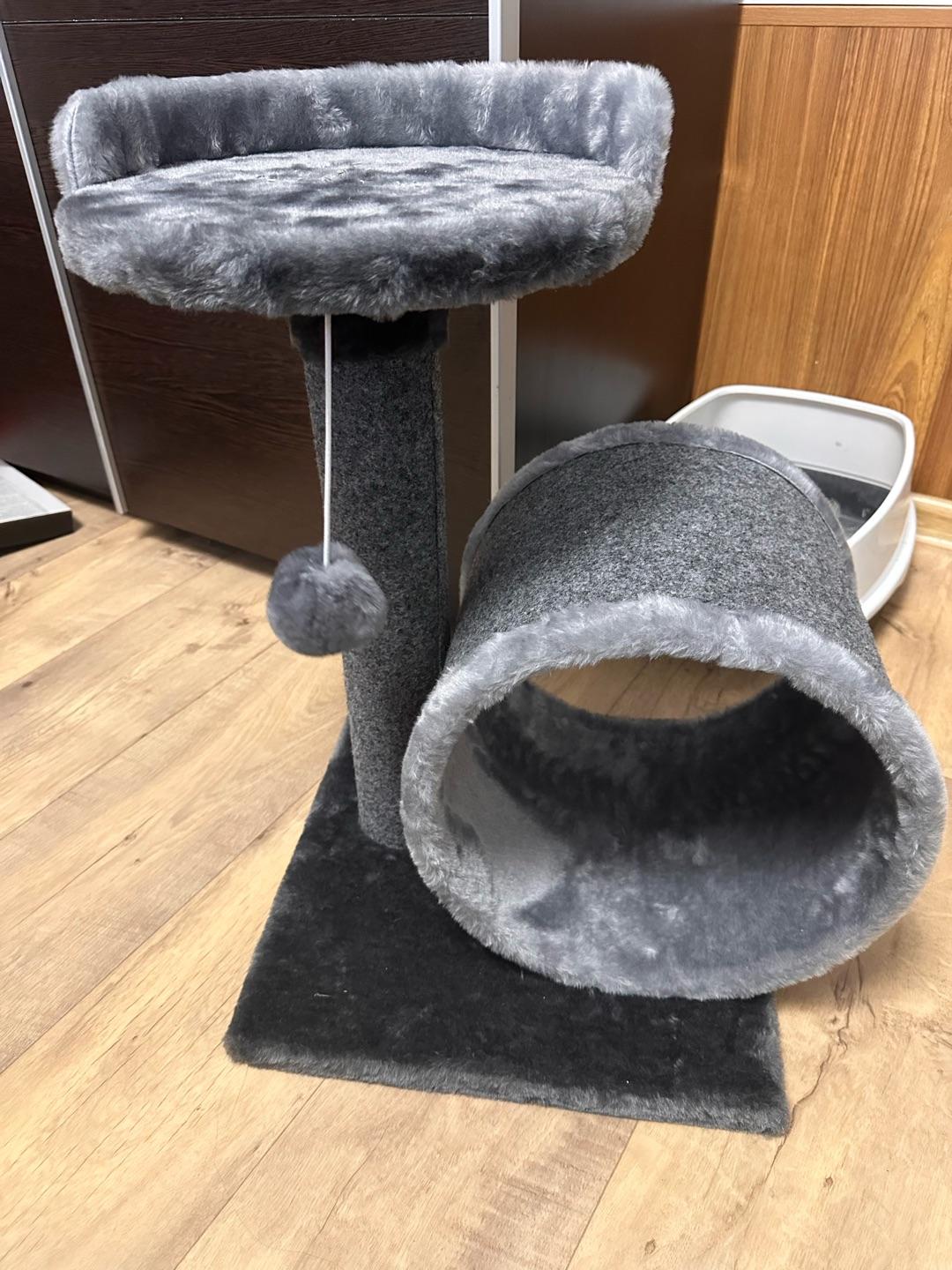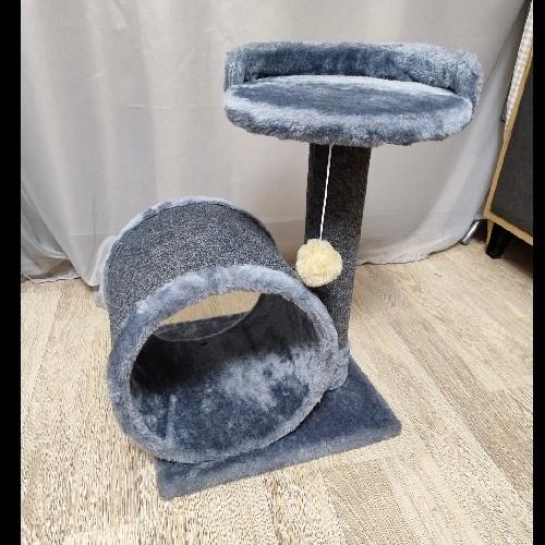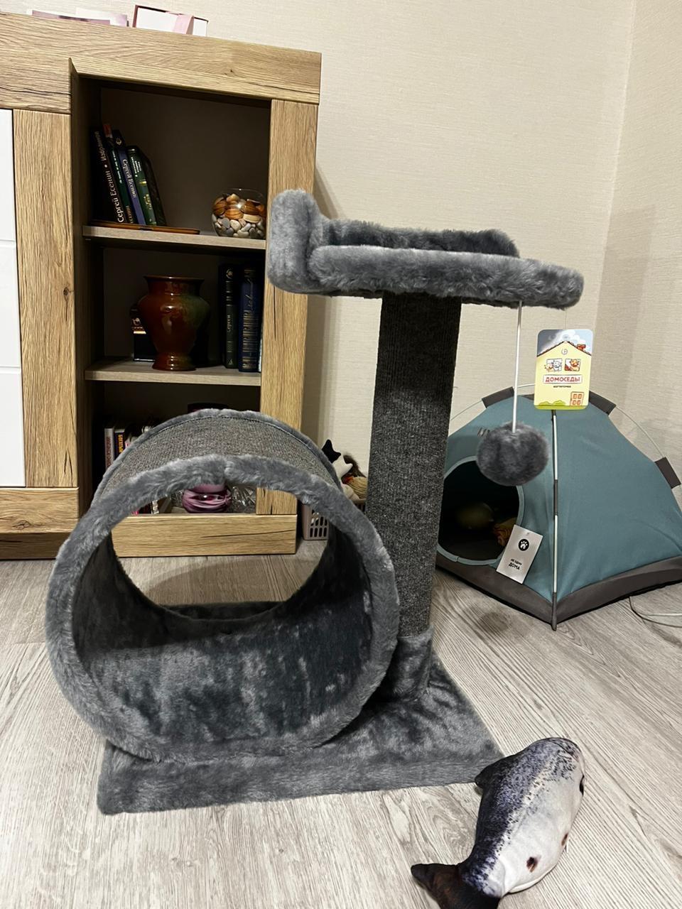 Когтеточка-столбик с игрушкой, полкой и тоннелем для кошек.