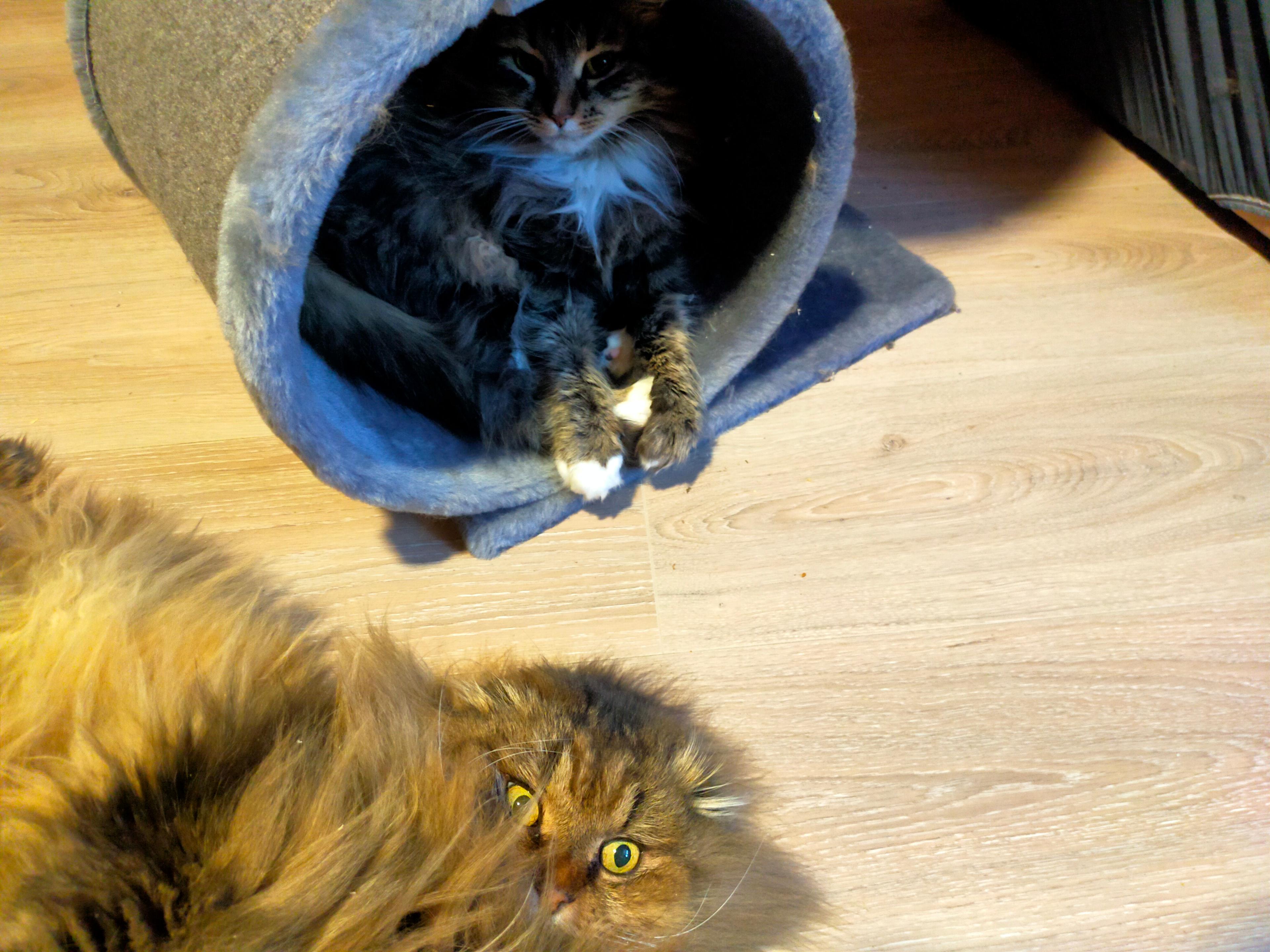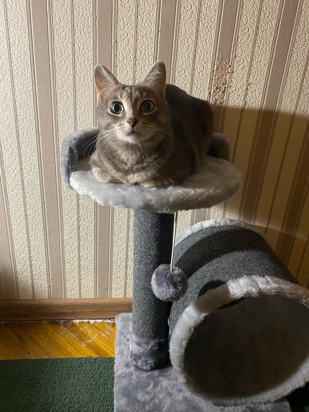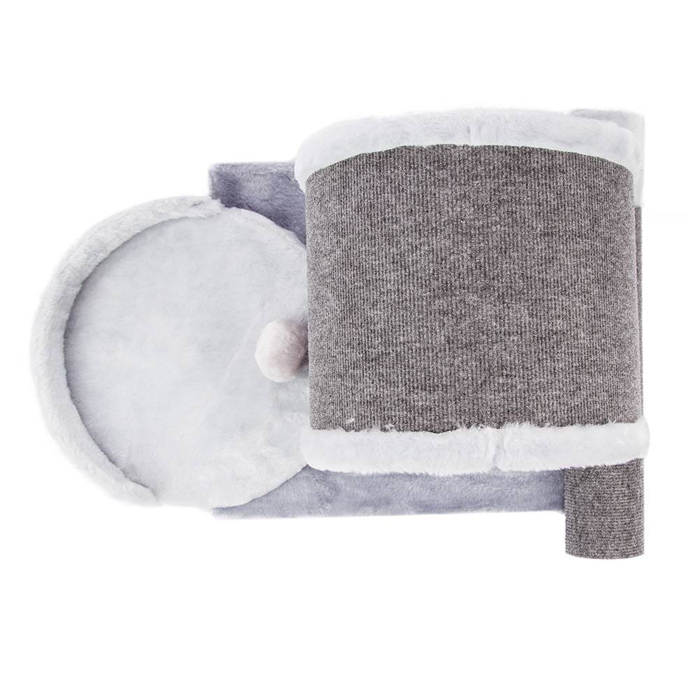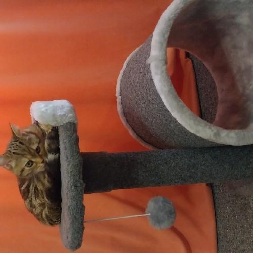 Когтеточка-столбик с игрушкой, полкой и тоннелем для кошек.