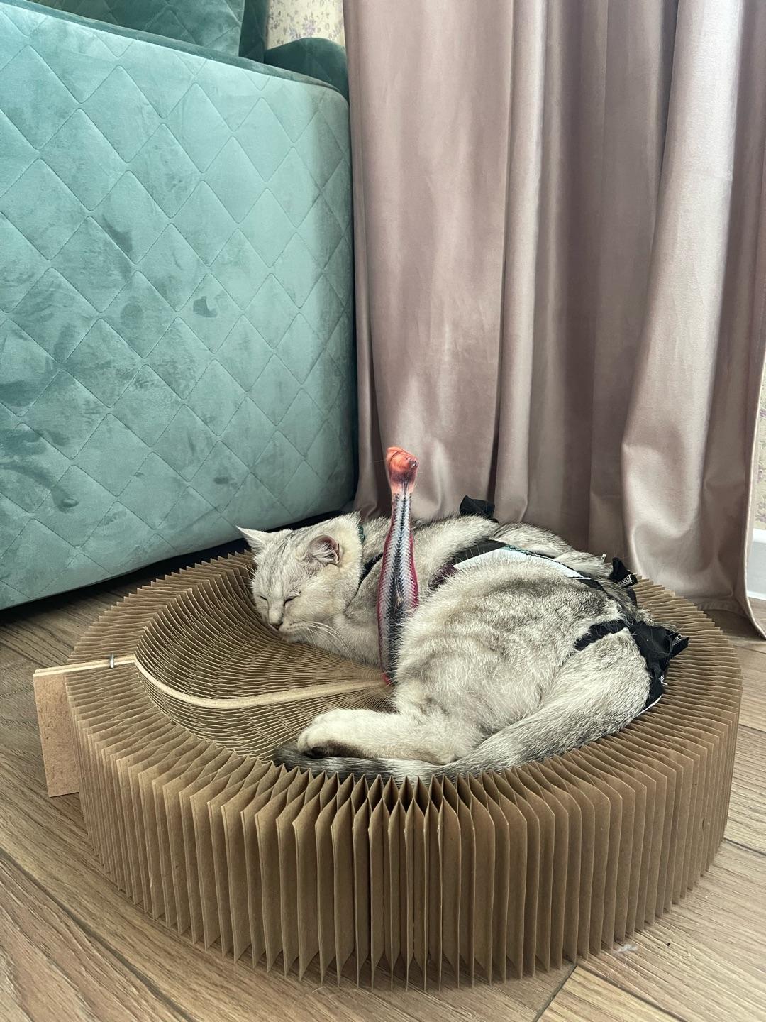 - Выгнутая форма когтеточки прекрасно подойдет не только для заточки когтей, а также для комфортного отдыха и сна.