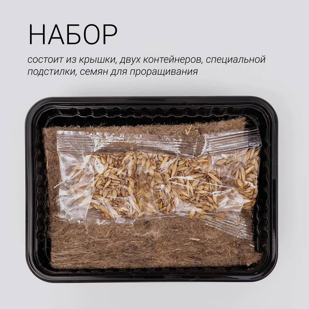 - Набор состоит из крышки и двух контейнеров: первый выполняет роль резервуара, в который стекают излишки воды после полива; второй используется как субстрат для проращивания и укоренения ростков будущего лакомства для питомца.