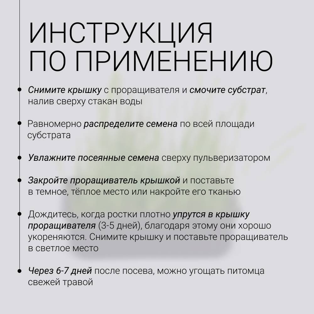 - Внимание! В пищу используются только ростки. Не оставляйте питомца без присмотра, чтобы избежать поедания семян и субстрата.