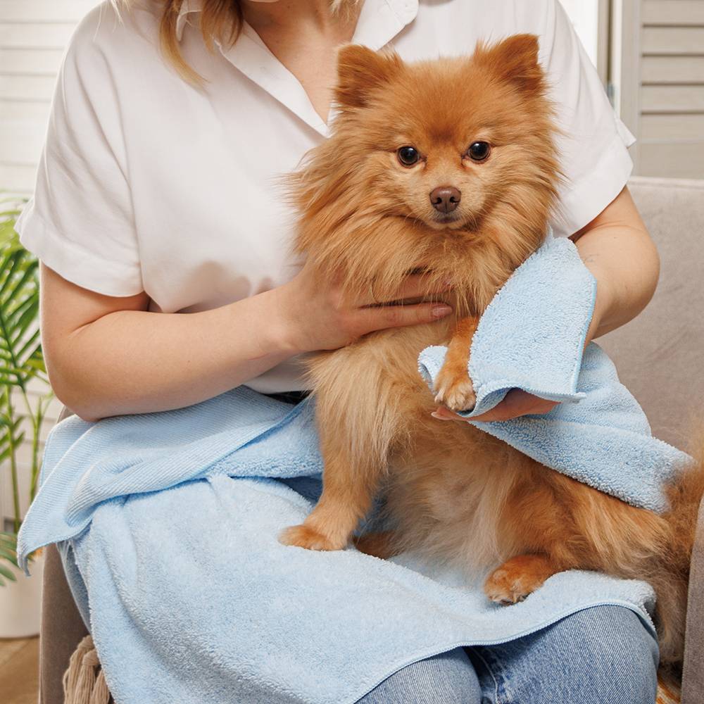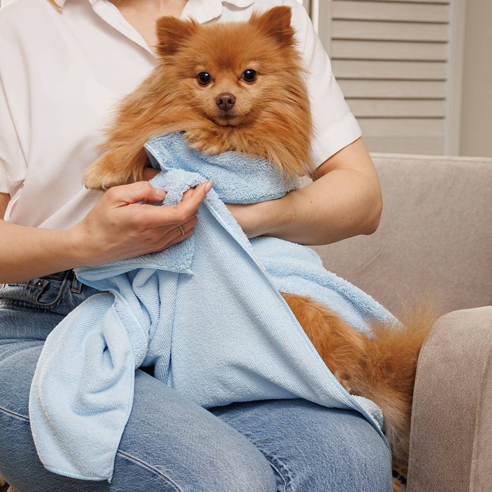 Полотенце для домашних животных из микрофибры от бренда Домоседы хорошо впитывает влагу и удаляет грязь с шерсти питомца.