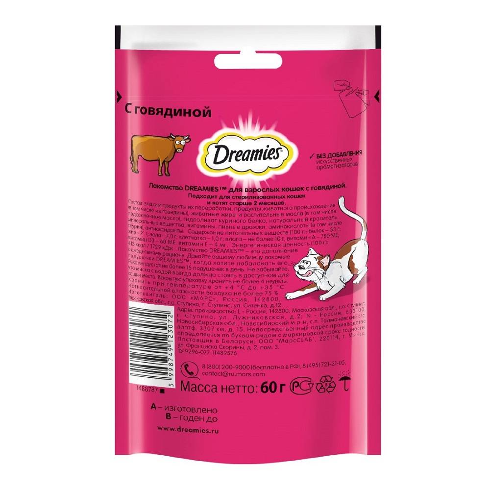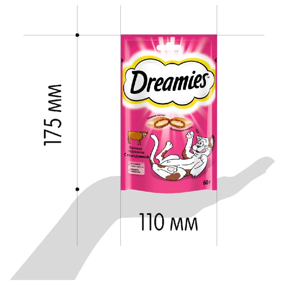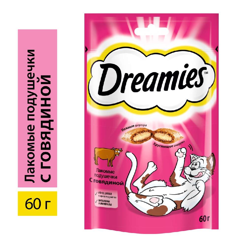 Лакомство Дримис для кошек с говядиной – угощение для настоящих гурманов. Будьте уверены, что с таким деликатесом ваша требовательная кошка останется довольной, сытой и счастливой. Изысканный вкус натурального мяса говядины, облаченного в запеченные подушечки из хрустящего теста, простимулирует аппетит животного и активизирует природные инстинкты домашней кошки.