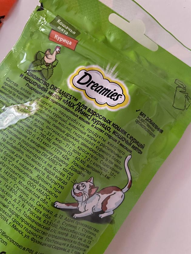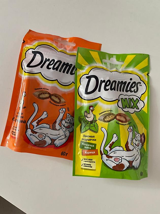 - Лакомые подушечки Dreamies содержат витамины А, D3, Е и группы В, и полезные для кошек минералы. А широкий ассортимент вкусов позволит внести разнообразие в ежедневный рацион вашего питомца, необходимое его внутреннему хищнику.
