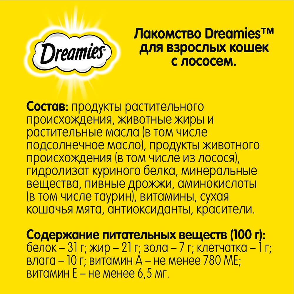DREAMIES™ с лососем – это лакомство, которое любят все коты на свете. Смело заводите дома аквариум, ваш усатый рыбак больше не обратит внимания на рыбок, ведь есть аппетитные хрустящие подушечки DREAMIES™ с нежным лососем внутри! Просто рыбная сказка для вашего кота! В состав DREAMIES™ Лакомые Подушечки входят важные для кошки питательные вещества, витамины и минералы, а значит, такое угощение приносит не только радость, но и пользу.