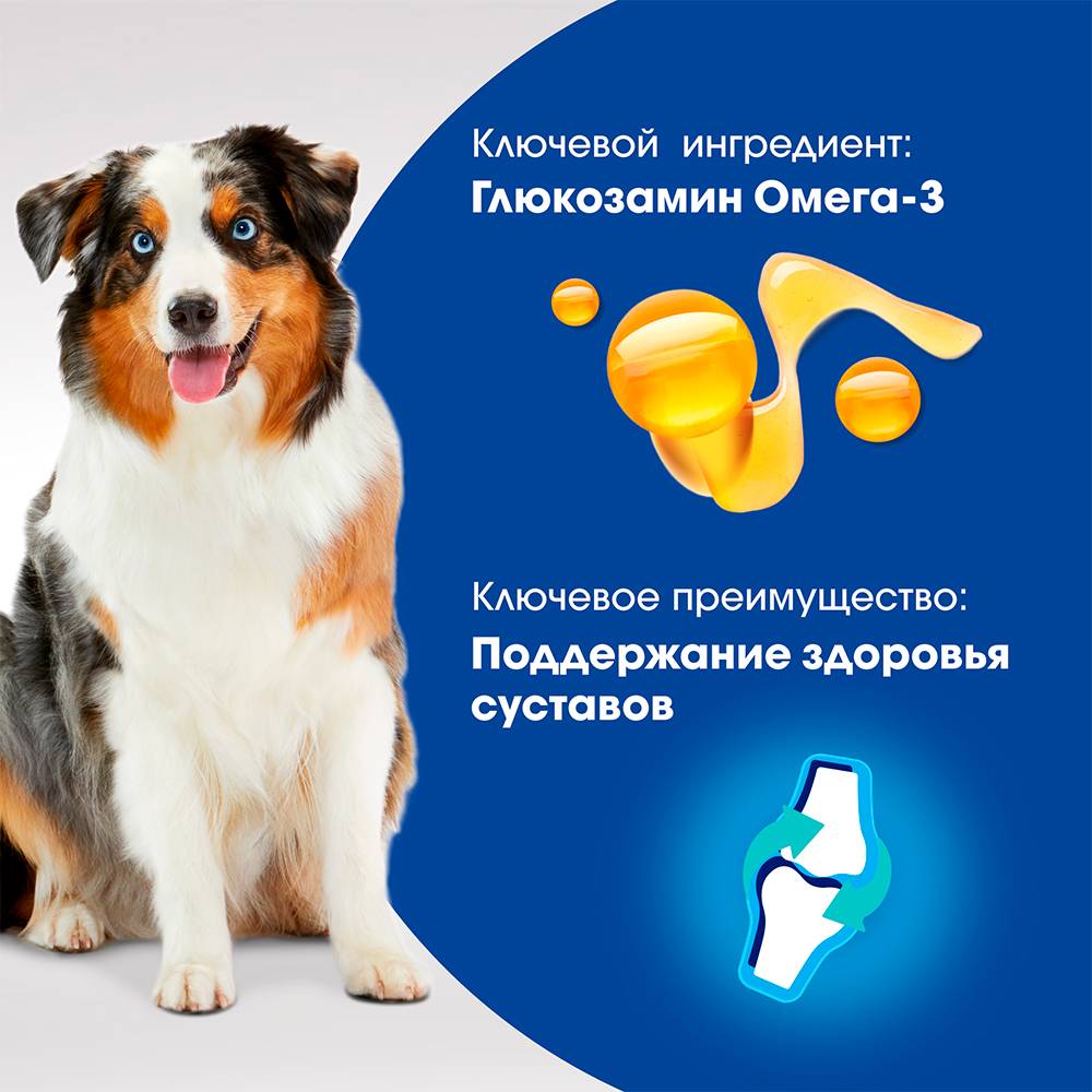 - Особый комплекс глюкозамина и омега-3 жирных кислот помогает организму поддерживать здоровье суставов при соблюдении рекомендаций по кормлению.