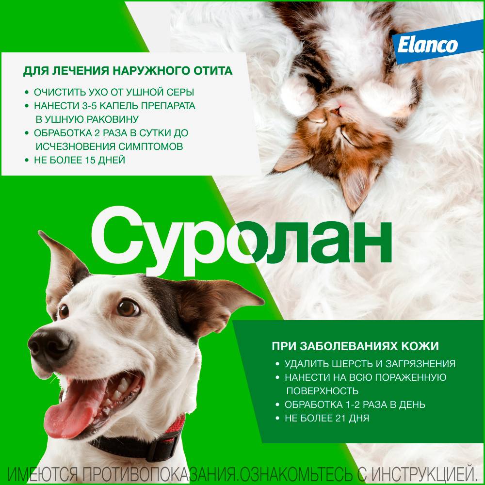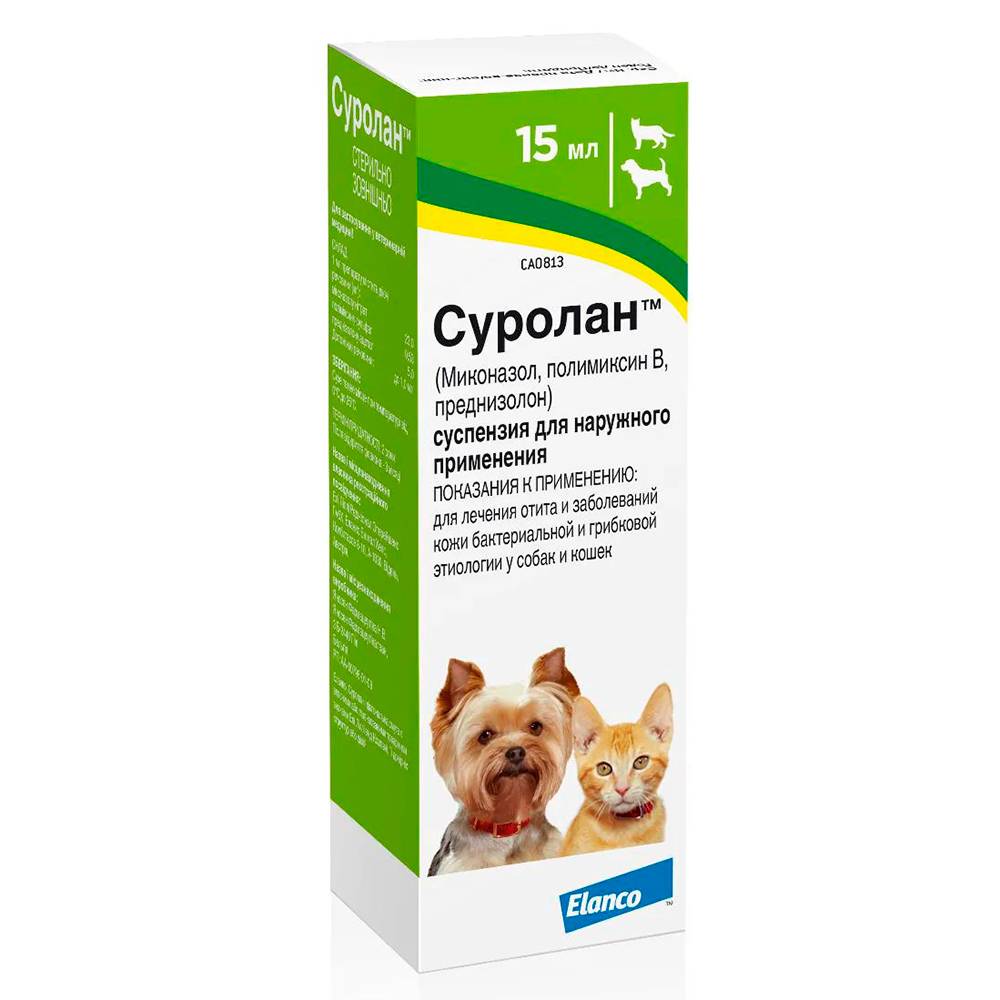 Суролан относится к группе антимикробных и антигрибковых лекарственных препаратов. Для лечения острого и хронического наружного отита (воспаления наружного слухового прохода) и воспалительных заболеваний кожи (дерматитов, пиодерматитов, дерматофитозов, инфицированных ран, абсцессов) бактериальной и грибковой этиологии. Обработку препаратом Суролан следует проводить 2 раза в сутки до исчезновения клинических признаков заболевания и затем продолжить еще в течение 2-3 дней, общий курс лечения не должен превышать 15 дней. В комплексной терапии отодектоза (ушная чесотка), осложненного отитом, Суролан применяют в той же дозе по той же схеме. При заболеваниях кожи Суролан капельно наносят на всю пораженную поверхность, предварительно удалив на пораженном и пограничном с ним участке шерсть, загрязнения, некротизированные ткани, гной и раневой экссудат. Обработку необходимо проводить 1-2 раза в день, продолжительность лечения определяется ветеринарным специалистом и зависит от степени поражения и скорости заживления тканей, но не более 21 дня.