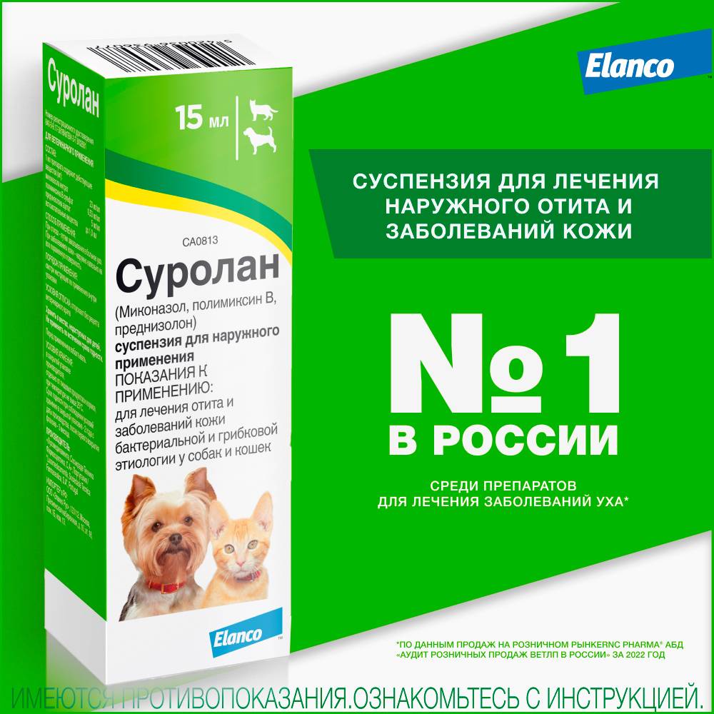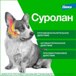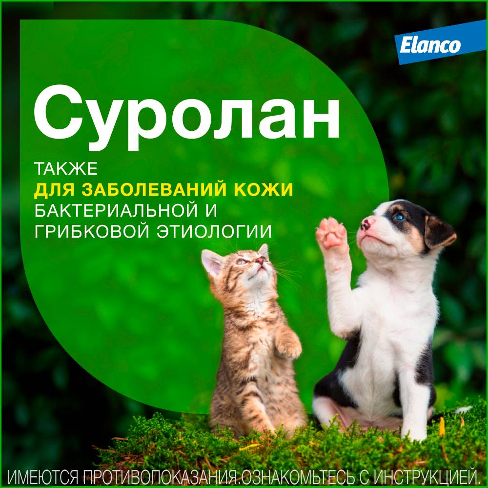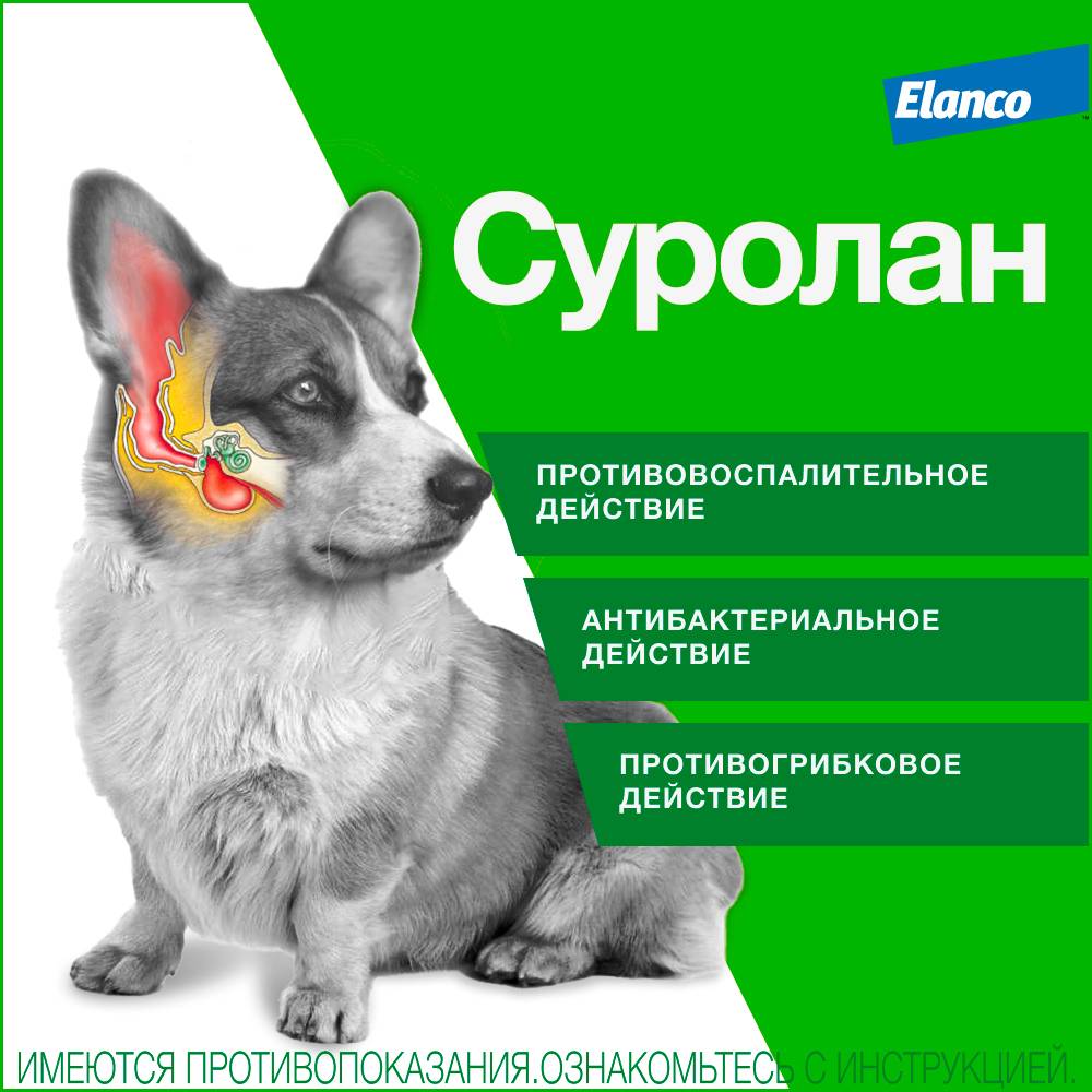 Препарат обладает широким спектром антимикробной и антигрибковой активности, оказывает противовоспалительное и противоаллергическое действие.Суролан – препарат компании Elanco.