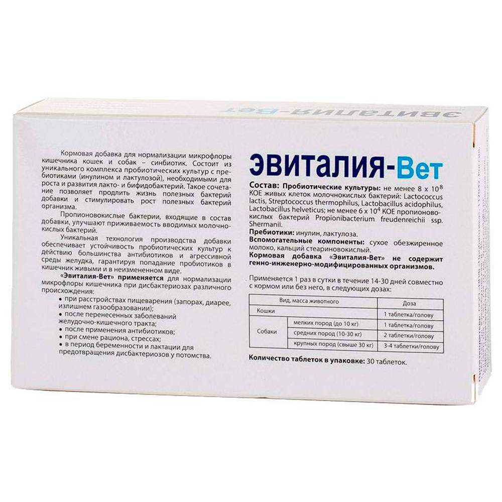«Эвиталия-Вет» применяется для нормализации микрофлоры кишечника животного при дисбактериозах различного происхождения: